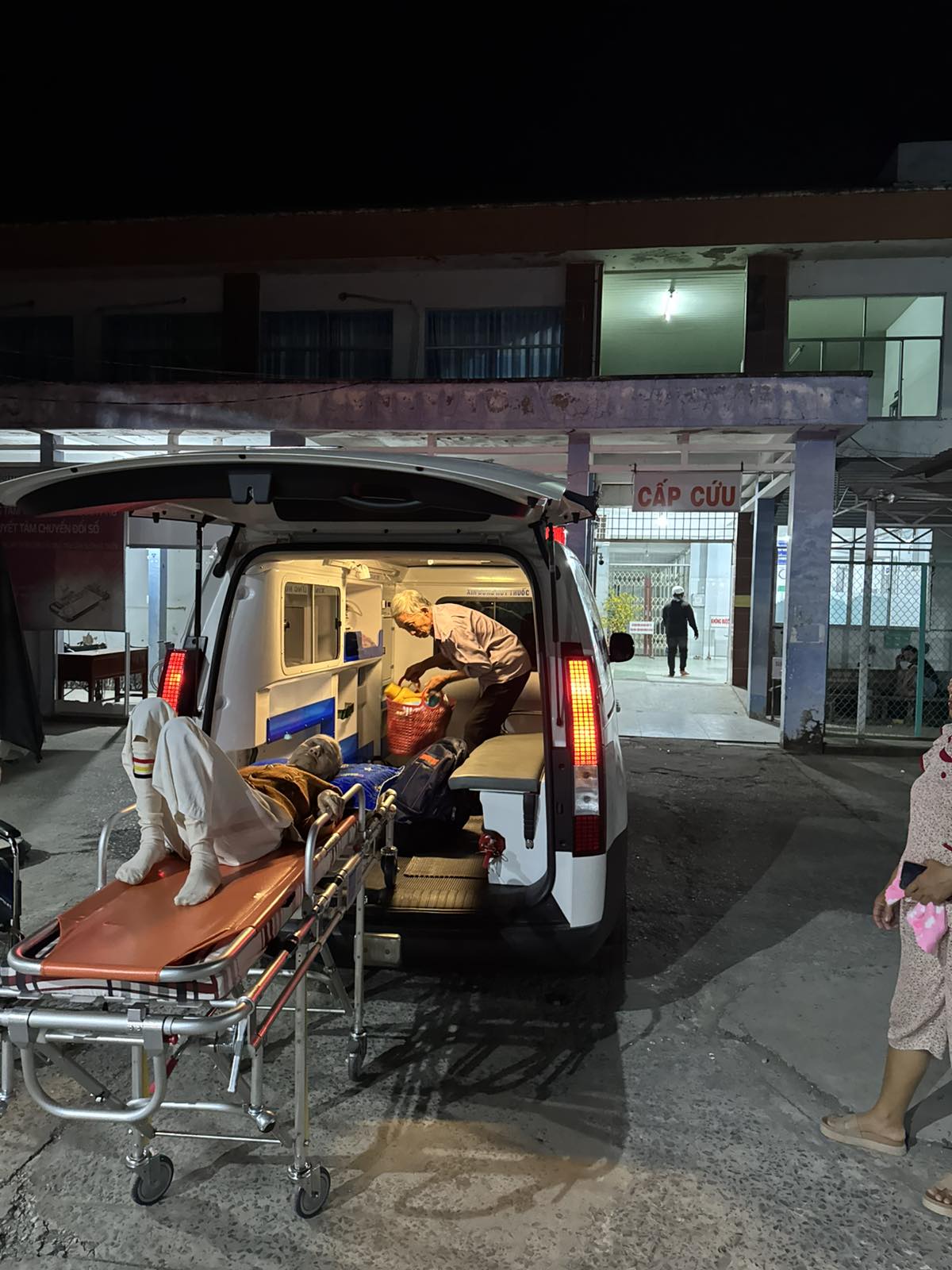 Ms. Trinh Thi Noi, 58 years old, lives in Con Mit, Thanh Phong commune, Thanh Phu district, Ben Tre province. She had a motorbike accident and severed her leg. She was taken to Thanh Phu hospital by ambulance at 4:15 a.m. on November 26, 2024.