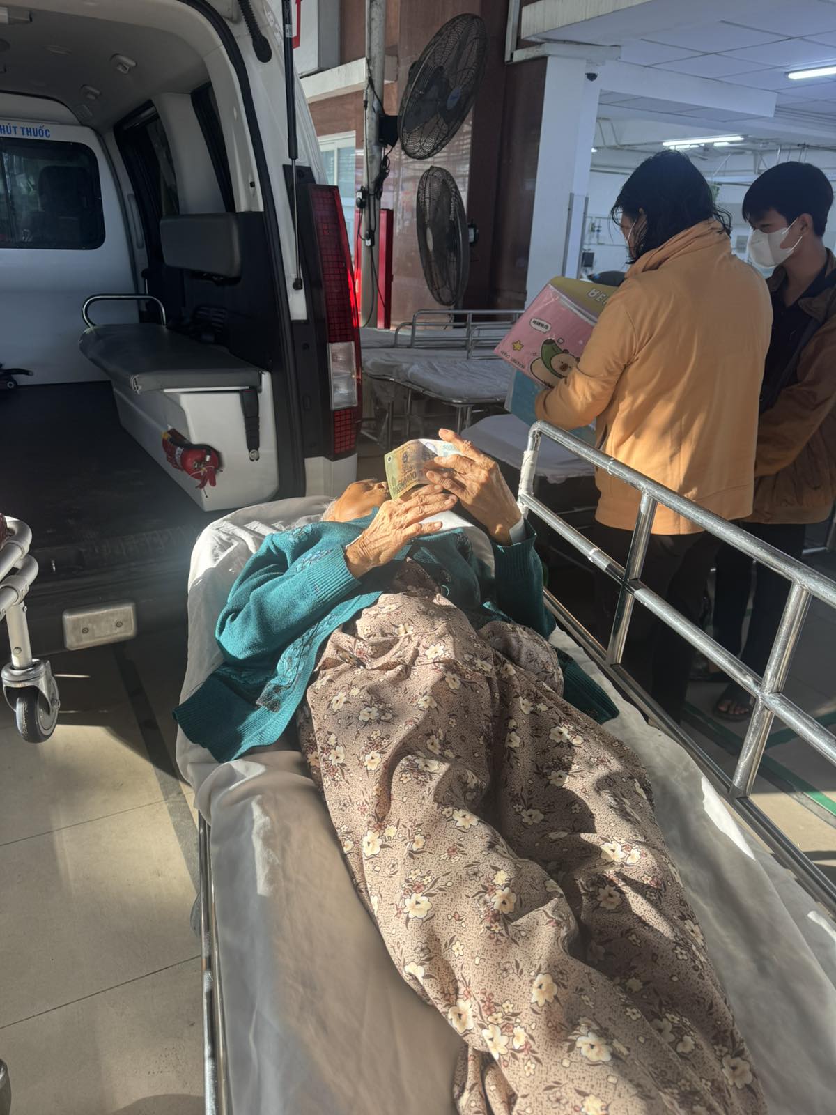 Mrs. Phạm Thị Nang, 83 years old, lives in Bồn Bồn, Thạnh Phong commune, Vĩnh Long province. She was unwell due to diabetes complications and was taken by ambulance to Minh Đức Hospital in Bến Tre at 5:30 AM on August 8, 2025. She currently lives with her child and was given a bottle of medicated green oil.