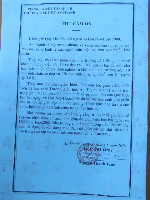 Nguyen Bao Ngoc, 4th grade – Father, Nguyen Van Tri, and wife have 3 children, residing in An Thanh hamlet, An Thanh village, Thanh Phu district, Ben Tre providence. Her parents support the family by walking to shops, markets, restaurants, etc. and sell lottery tickets