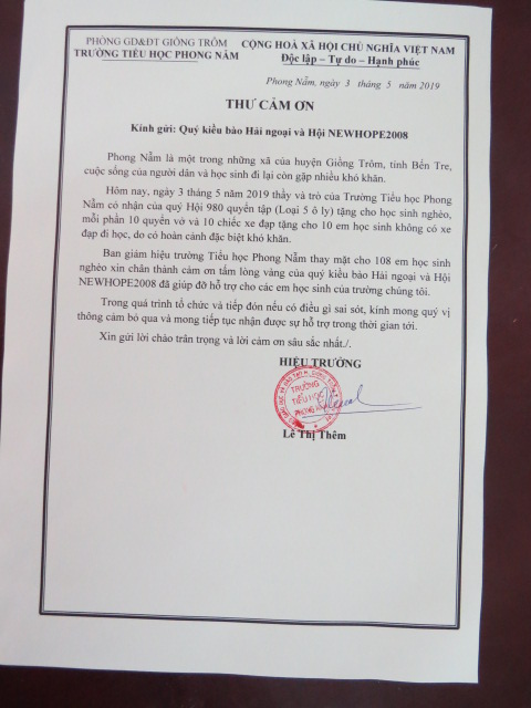 Ho Hoang Tri, 4th grade – Father, Ho Hoang Minh. His parents divorced and living with his grandparents, residing in 3 hamlet, Phong Nam village, Giong Trom district, Ben Tre providence.