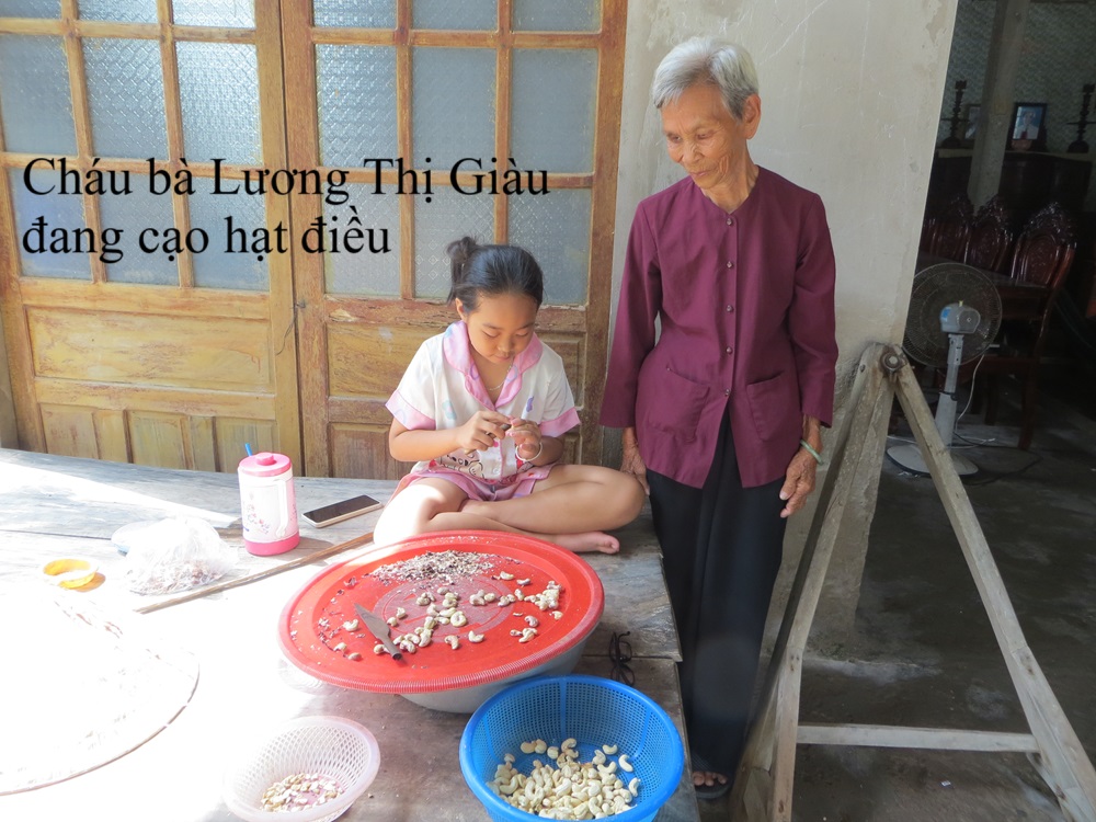 Mrs. Lương Thị Giàu, 86 years old. Every day, she travels to her nephew’s house in Thạnh Phú town to sell lottery tickets and earn a little extra income to support her children and grandchildren. Her family members do not have stable jobs; they peel cashew nuts daily for meager earnings. She resides at 70/2, An Bình Hamlet, Mỹ An Commune, Thạnh Phú District, now Thạnh Phú Commune, Vĩnh Long Province.