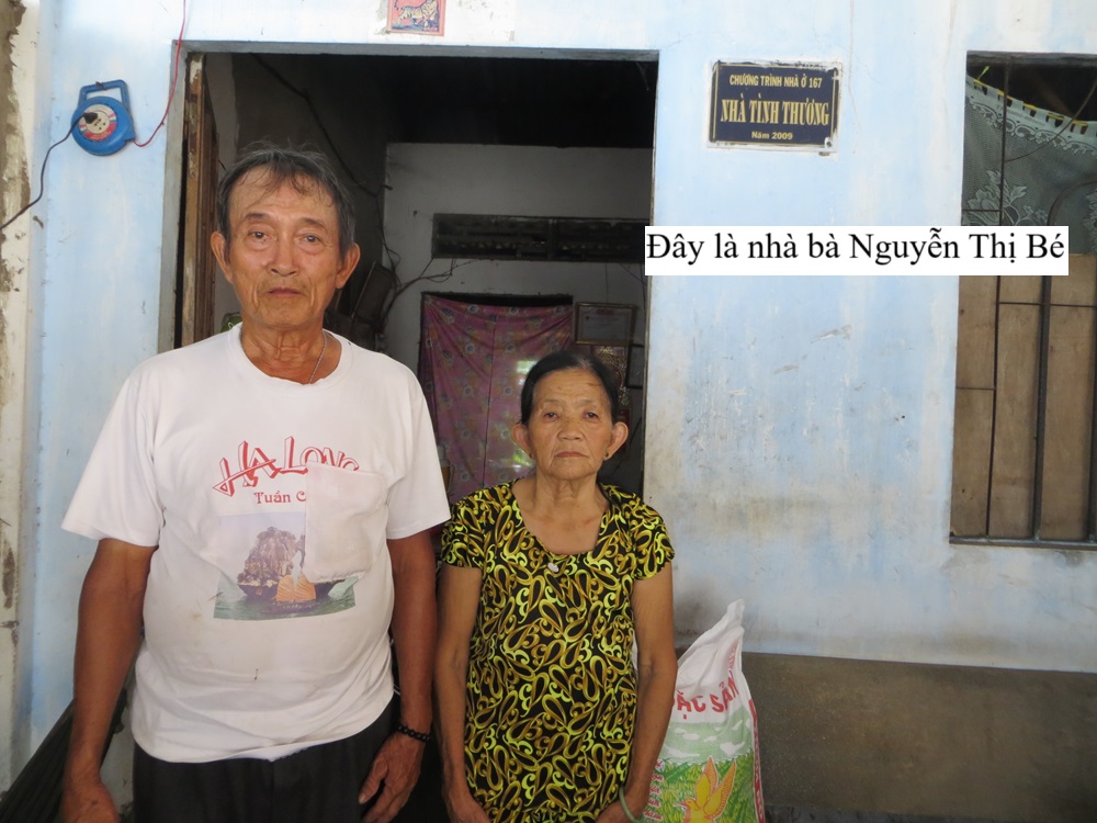 69. Bà Nguyễn Thị Bé, 71 tuổi. Chồng là ông Nguyễn Văn Chương, 67 tuổi. Hàng ngày hai ông bà đi nhặt ve chai để kiếm sống. Hiện cư ngụ tại số nhà 1/4 ấp Thạnh Lợi, xã Bình Thạnh, huyện Thạnh Phú, tỉnh Bến Tre.