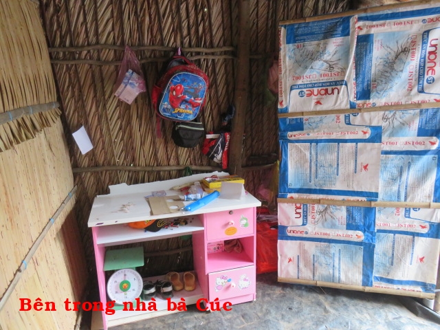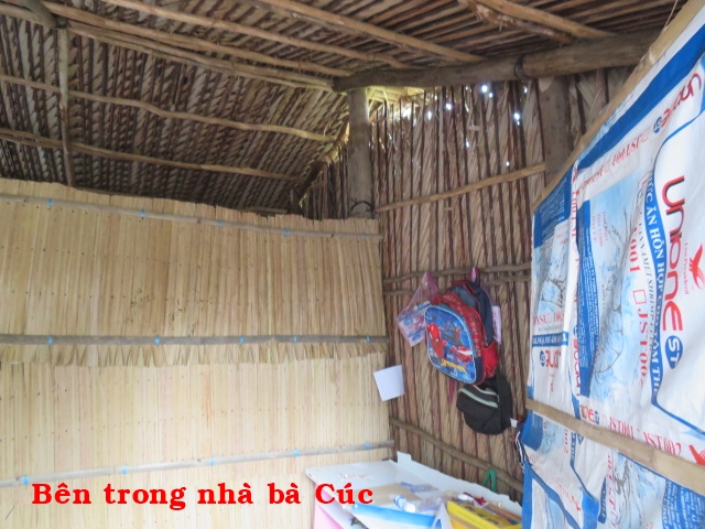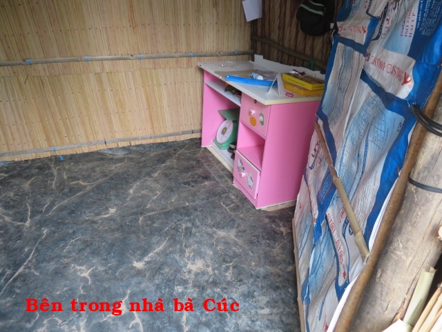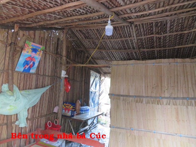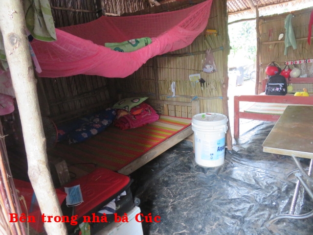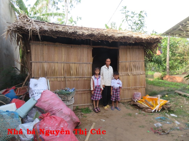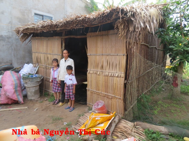 Bà Nguyễn Thị Cúc, 39t, nhà ở Khâu Băng, xã Thạnh Phong, huyện Thạnh Phú, tỉnh Bến Tre. Gia đình có 3 người: bà và 2 con. Chồng bà bỏ từ lúc mang bầu bé thứ nhì, nhà không có ruộng đất, hàng ngày đi mua về chai để nuôi con. Thu nhập chỉ đủ mua gạo, căn nhà được cất nay hơn 3 năm cột chôn bằng cây mắm. Hiện tại chân cột bị mụn mà không có tiền cất lại.