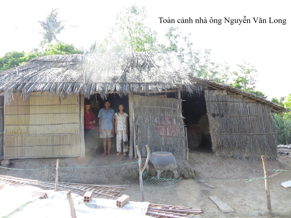 Mr. Nguyễn Văn Long, 75 years old. His son, Nguyễn Văn Khanh, 41 years old, works as a laborer in the local area, taking on whatever jobs are available, with an unstable income. Mr. Long has a paternal granddaughter named Nguyễn Thị Ngọc Nhi, 12 years old, currently in 7th grade. The roof and walls of Mr. Long’s house are made of leaves and are now severely deteriorated and rotting, but he has no means to rebuild the house. He currently resides at 31/1, Thạnh An Hamlet, Bình Thạnh Commune, Thạnh Phú District, Bến Tre Province (formerly), now Thạnh Phú Commune, Vĩnh Long Province.