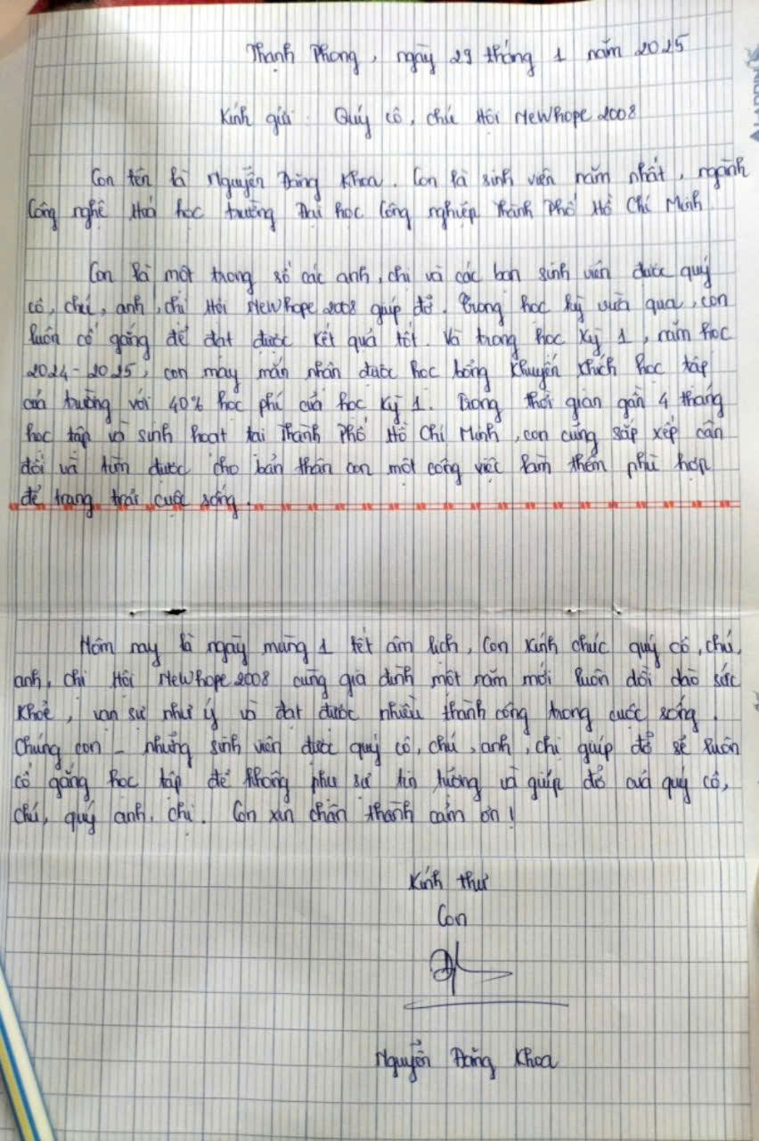 Cô chú có khỏe không ạ? Hôm nay con viết lá thư này là để hỏi thăm quý cô chú, và để thông báo tình hình học tập của con hiện nay ạ, con vừa hoàng thành khá tốt học kỳ 1 của năm 2 con đạt học sinh giỏi ạ , và con đã bước vào học kỳ 2 của năm 2 rồi ạ. Gần đây con có tham gia một cuộc thi chạy marathon do thành phố Hồ Chí Minh tổ chức và con đã đạt được huy chương con rất vui ạ. Nhờ sự giúp đỡ của quý cô chú mà con có cơ hội học tập và phát triển bản thân của con, nhiều lúc học tập khiến con mệt mỏi nhưng khi còn nhớ tới gia đình con còn nhiều khó khăn và quý cô chú những người đã hổ trợ cho con thì con luôn cố gắng học tập không bỏ cuộc.