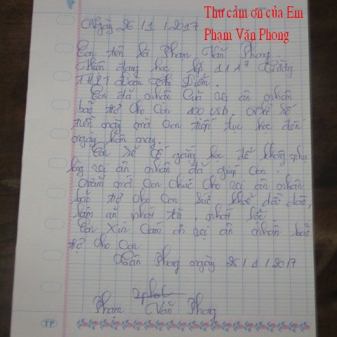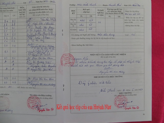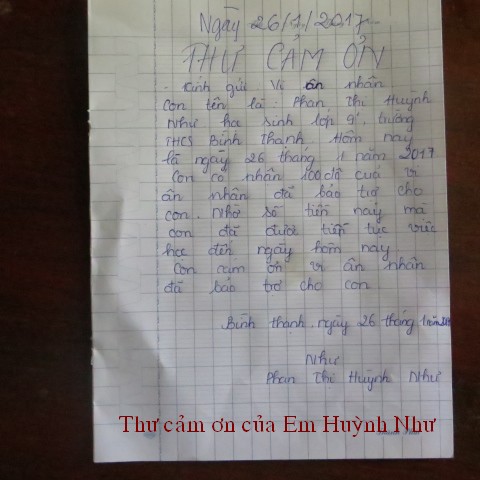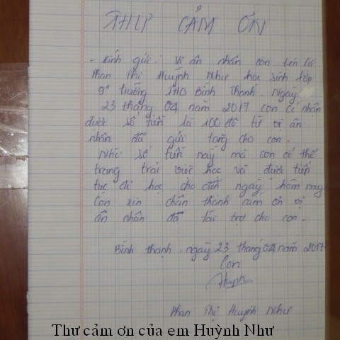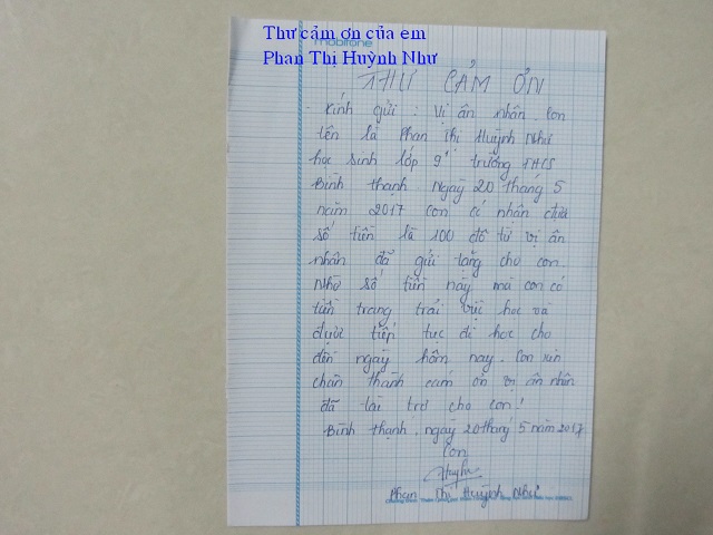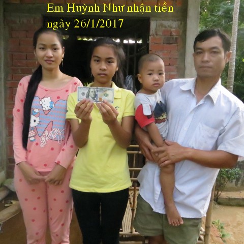 2/ Em Phan Thị Huỳnh Như đang học lớp 9 trường THCS Bình Thạnh. Mẹ em bị bệnh ung thư đã chết cách nay hơn một năm. Nhà em có 4 người. Ba em Ông Phan Văn Bé Chín, 40 tuổi. Chị em là Phan Thị Ngọc Hân, 18 tuổi đang thi đỗ Đại học sư phạm ngành Văn. Bé trai nhỏ mới 2 tuổi. Ba em không nghề nghiệp ai thuê gì làm nấy mỗi ngày 150.000 đồng (7 đô) nhưng ngày có ngày không. thu nhập rất bấp bênh. Hiện ngụ tại số nhà 116/2, ấp Thạnh Quí B, xã Bình Thạnh, huyện Thạnh Phú, tỉnh Bến Tre.