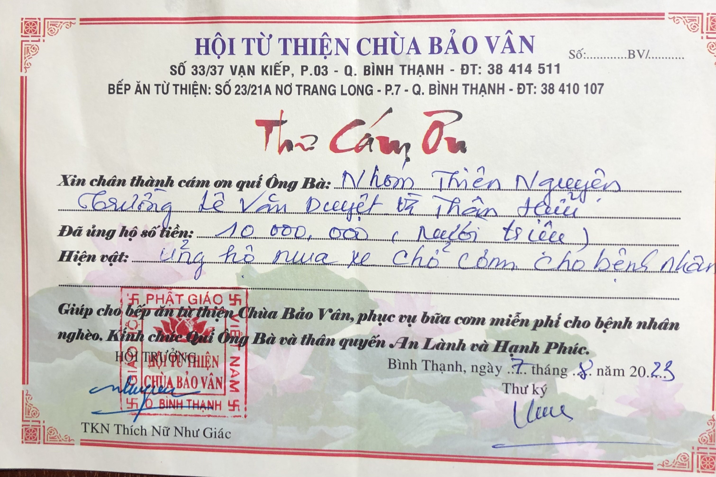 Tặng Hội TT Bảo Vân 10.000.000₫.