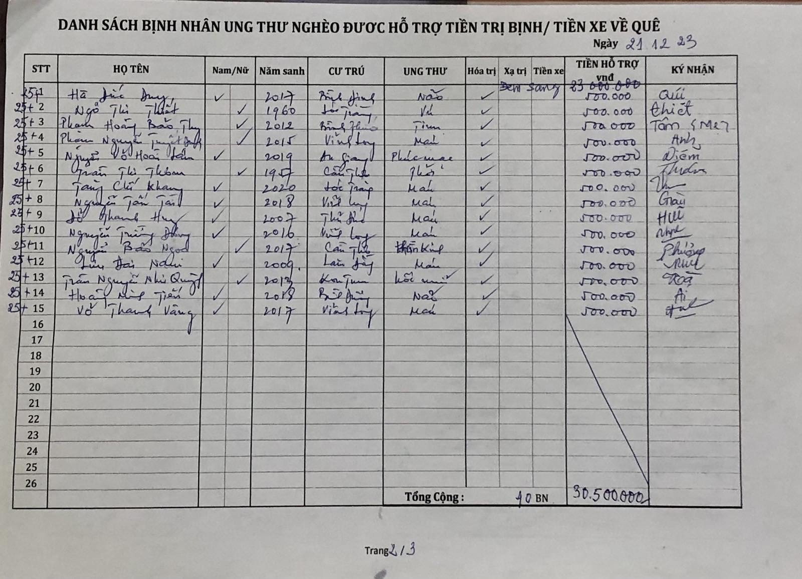 Được giúp tiền trị bịnh trong tháng 12/23 có đến 21 bịnh nhi (52,5%) sinh 2017 đến 2023; và các cháu đa phần bị ung thư máu (39%) và não (39%).!!
