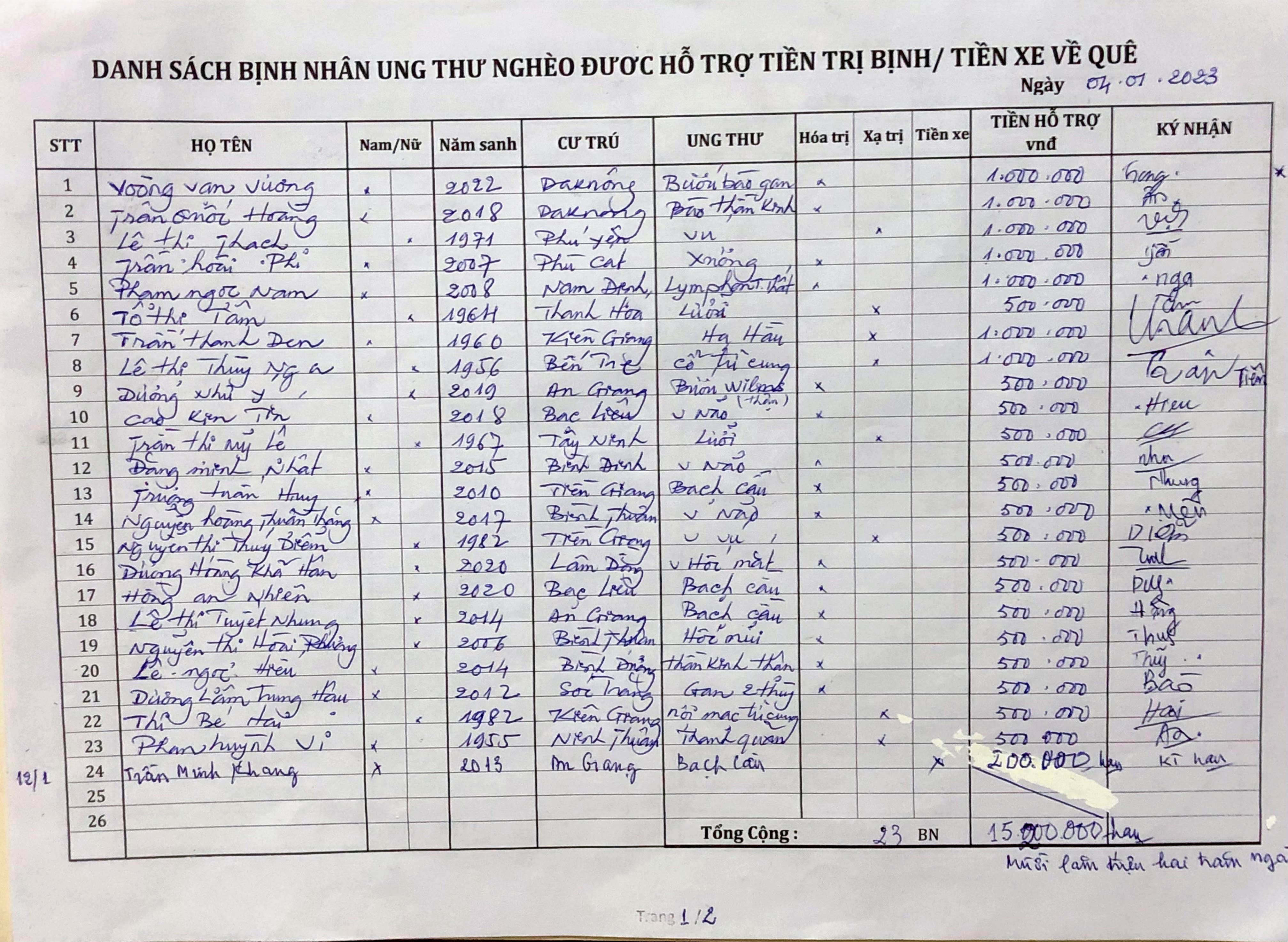 1. 1/ 23 BN đã được hỗ trợ 15.000.000₫ tiền trị bịnh ngày 04/01/23 và 1 BN được phụ tiền xe về quê 200.000₫ ngày 12/01/23.