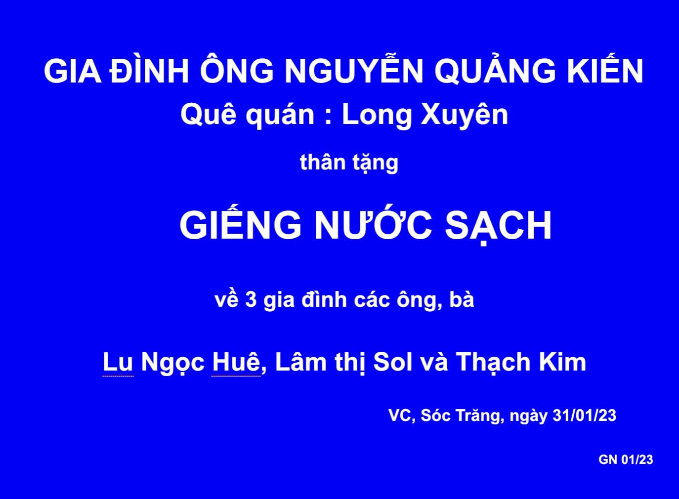 Giếng Nước Sạch 01/23 ( hình và video IMG_57286211.MOV) được Gia Đình Ông Nguyễn Quãng Kiến, quê quán tại Long Xuyên tài trợ cho 3 gia đình Lu Ngọc Huê, Lâm thị Sol và Thạch Kim tại Vĩnh Châu, Sóc Trăng..