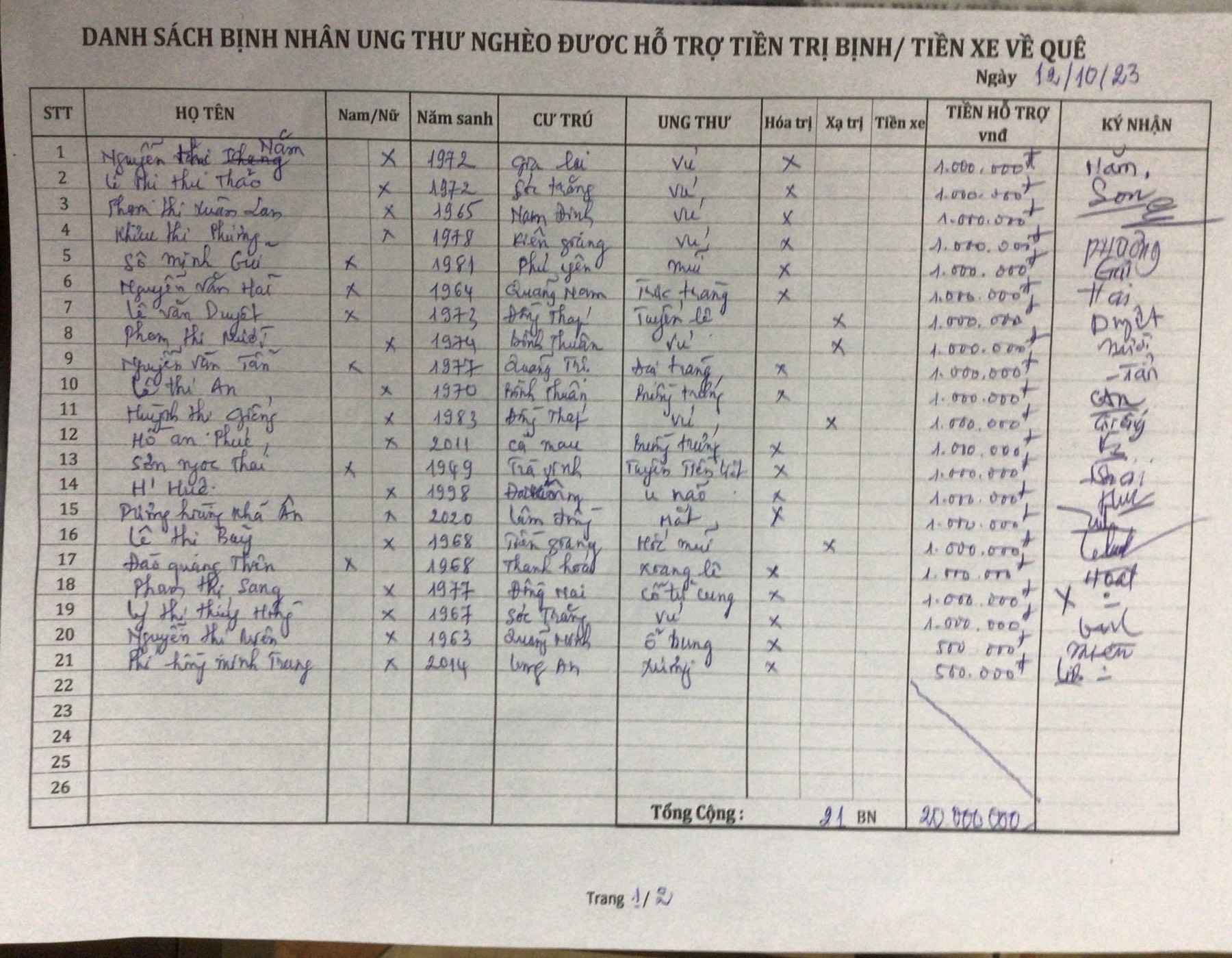 Đã hỗ trợ 20.000.000₫ tiền trị bịnh cho 21 BNUT ngày 12/10 (hình và video IMG_248621826.MOV).