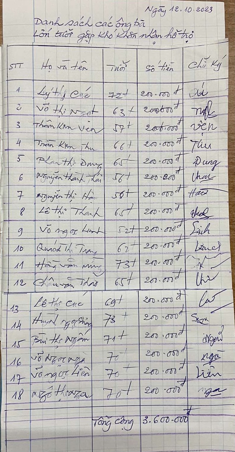 2./ Tặng 3.600.000₫ cho 18 người già bịnh tật mà phải tự mưu sinh tại khu vực BVUB ngày 12/10/23. theo hình 13 & các hình đại diện ( hình 14-16) và chi tiết về quỹ giúp người già có hoàn cảnh khó khăn.