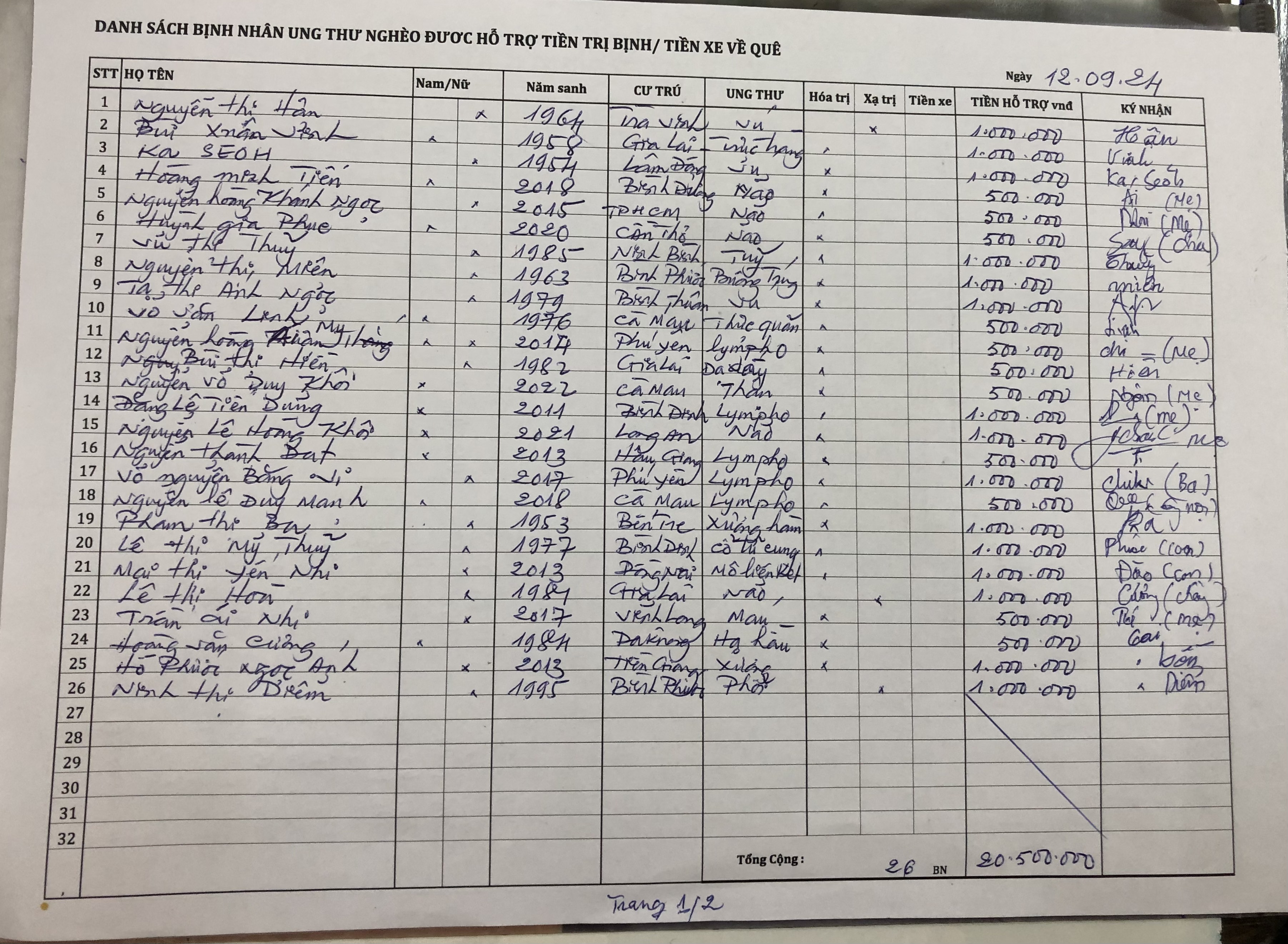 Đã hỗ trợ 20,5 triệu tiền trị bịnh cho 26 Bệnh Nhân (chi tiết trong hình) .