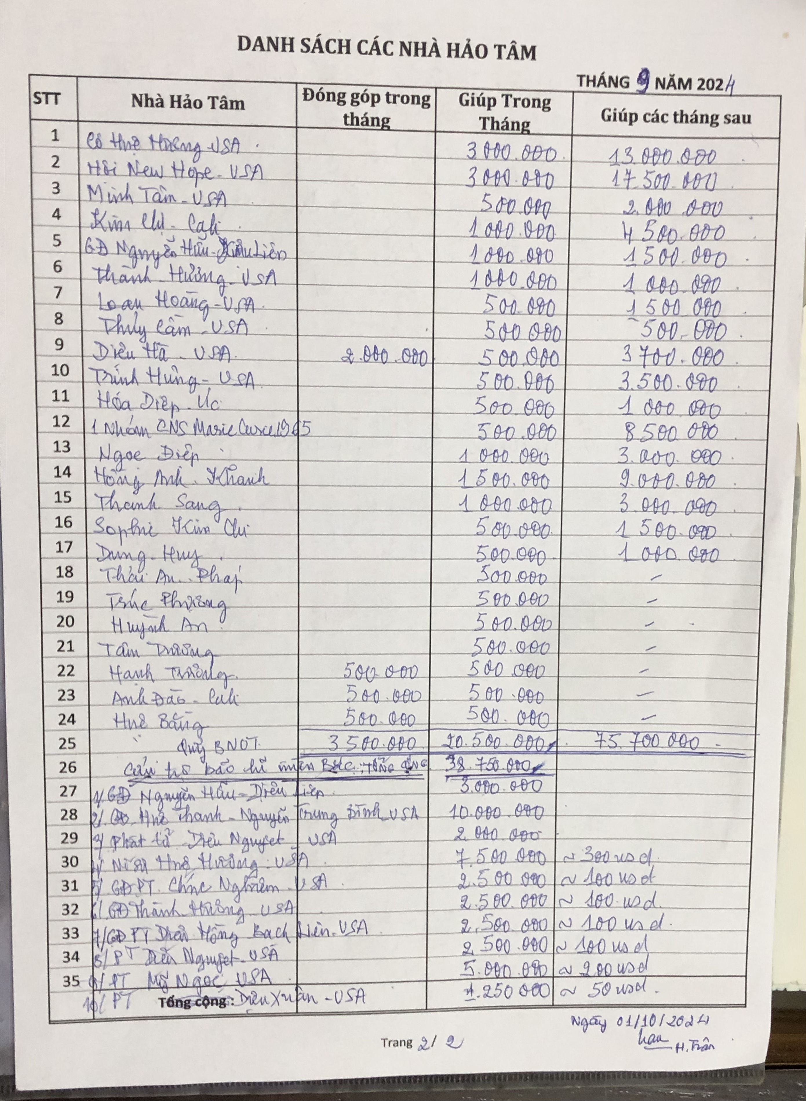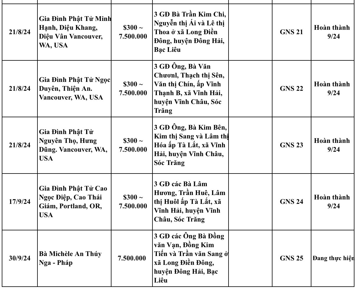 1./Cứu trợ bão lũ miền bắc: 38.750.000₫ được gởi đến Ni chúng thành phố HCM (qua trung gian chùa Giác Tâm), để tổ chức cuộc cứu trợ vào giữa tháng 10/24.