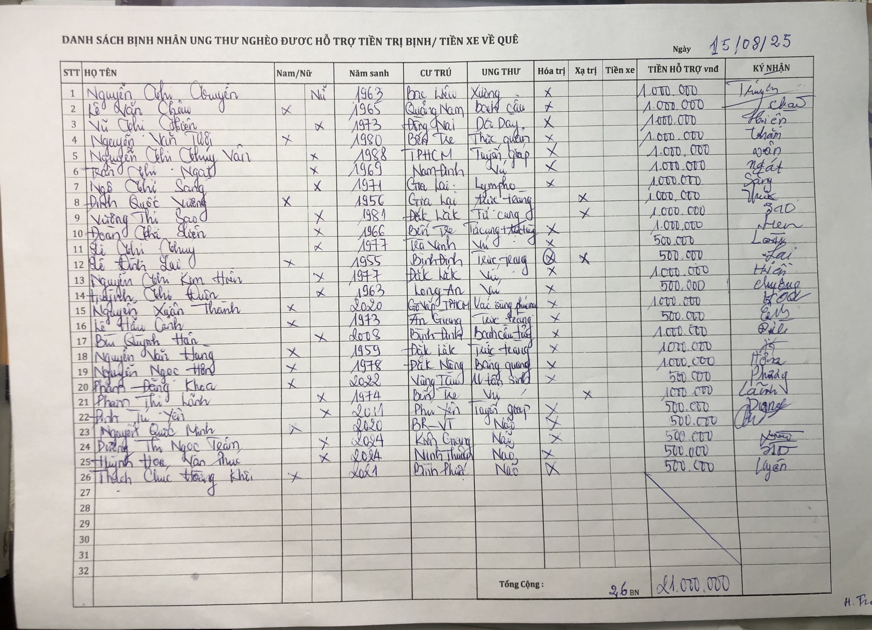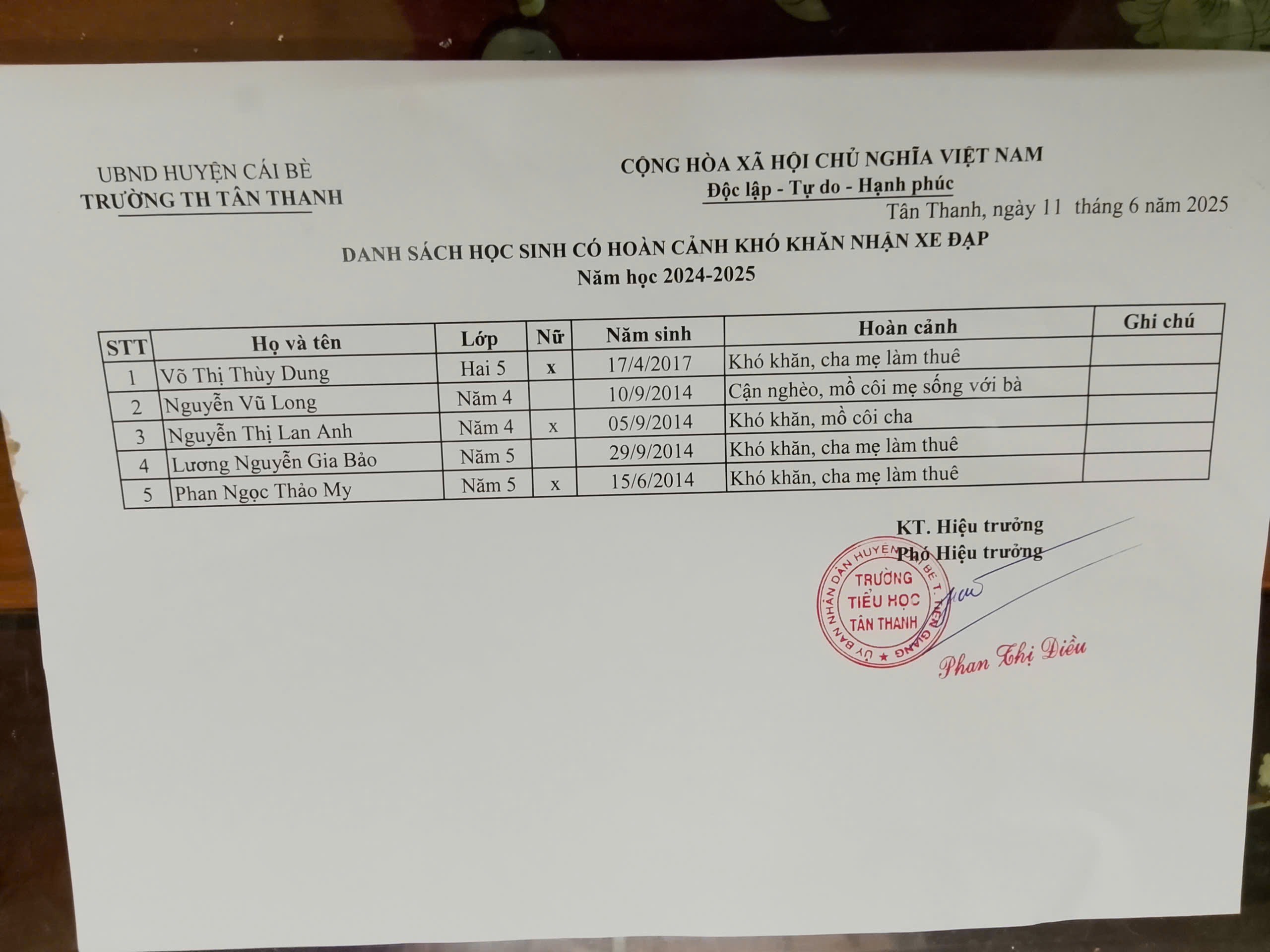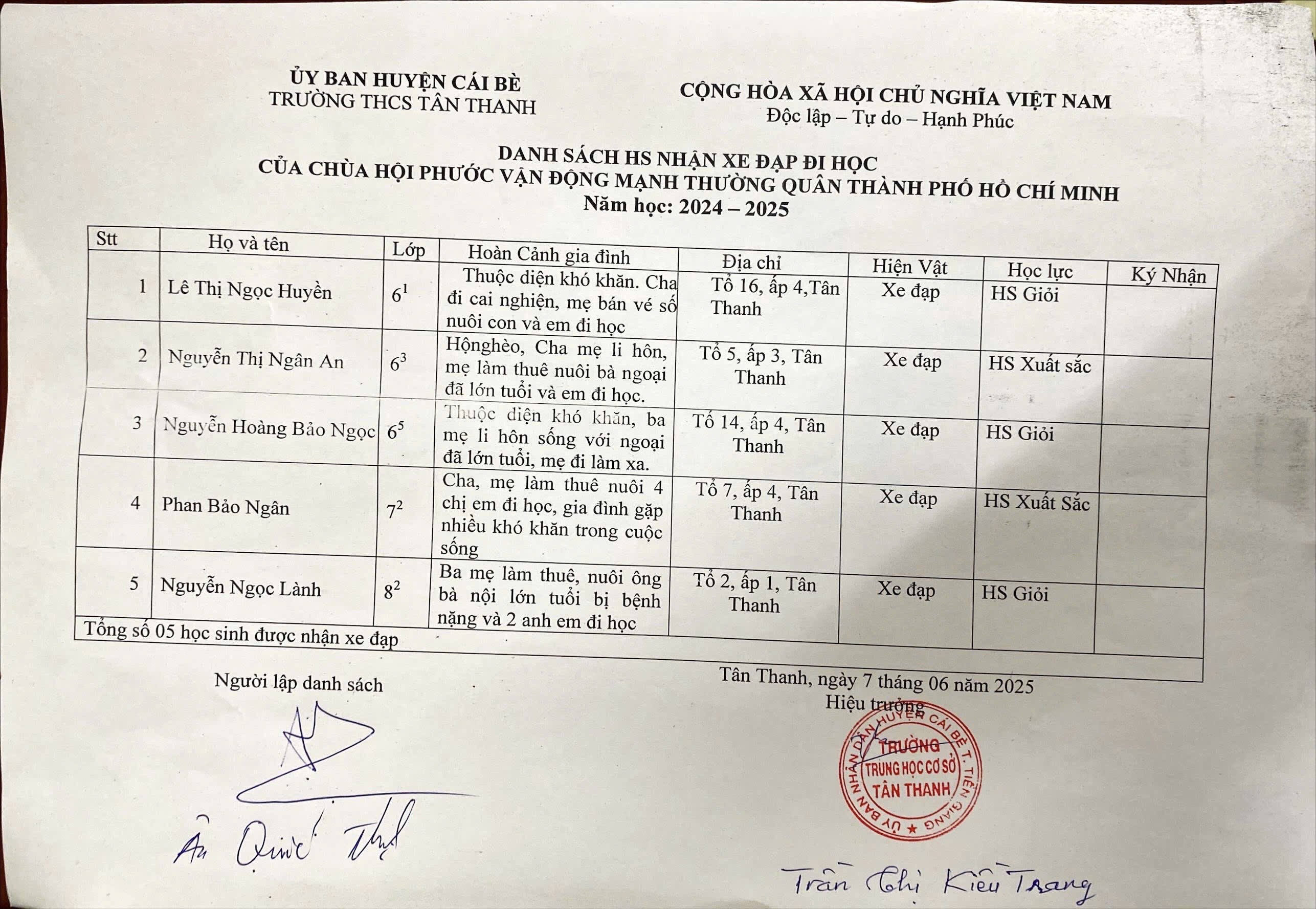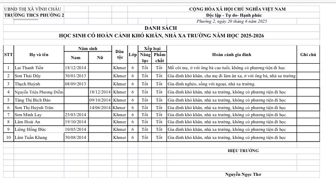 2.1 Tại Trường Trung học Cơ sở, P. 2, Vĩnh Châu, Sóc Trăng: tặng 10 học sinh lớp 6, mỗi em 1 chiếc xe đạp mới và 10 kg gạo. (danh sách trong hình)
