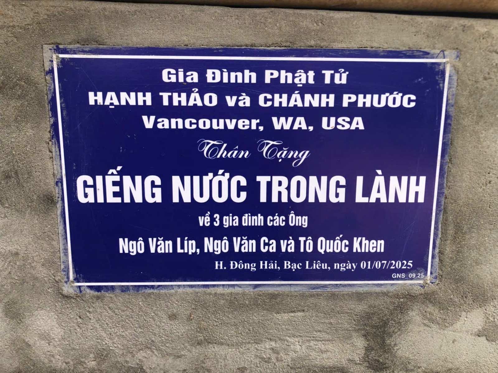 Hoàn thành : GN09_25 được Gia đình PT Hạnh Thảo và Chánh Phước ( Vancouver, WA, USA) tài trợ trong tháng 5/25, cho 3 gia đình nghèo Ngô văn Líp, Ngô văn Ca và Tô Quốc Khen tại huyện Đông Hải, Bạc Liêu