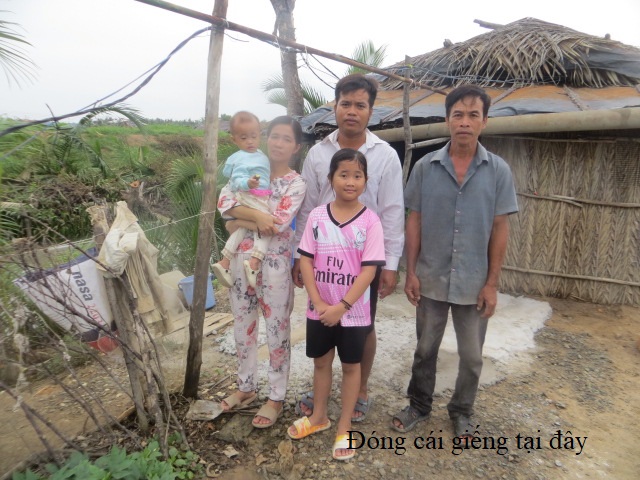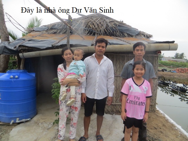 Mr. Du Van Sinh, 53 years old. He has a son named Du Van Nhut, 33 years old, a daughter-in-law named Tran Thi Thu Hang, 32 years old and 2 grandchildren: Du Tran Nhu Y, 9 years old, in 3rd grade and Du Tran Cat Tuong, 2 years old. The family is a poor household and does not have a well; they have to carry water from the neighbor's house for use. They currently live in Thanh Tan hamlet, Binh Thanh commune, Thanh Phu district, Ben Tre province.