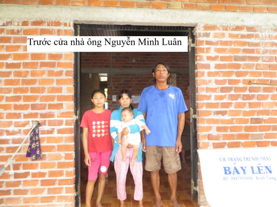 Nguyễn Minh Luân, 45 years old, and his wife Nguyễn Thị Quyền, 32 years old, have two children: Nguyễn Thị Như Quỳnh, 11 years old, in 5th grade, and Nguyễn Huỳnh Bảo Vy, 7 months old. Mr. Luân works as a construction helper in the village, while his wife stays home to take care of the baby. Their income is only enough for basic living expenses, so they cannot afford to build a water well. They currently live at 484/2, Thạnh Quí B Hamlet, Bình Thạnh Commune, Thạnh Phú District, Bến Tre Province, now part of Thạnh Phú Commune, Vĩnh Long Province.