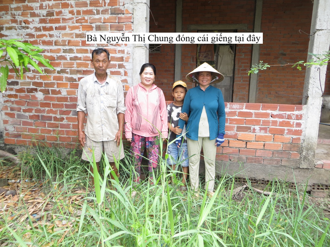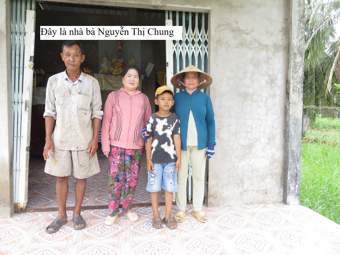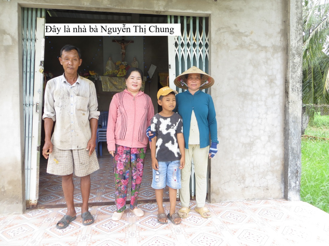 Mrs. Nguyễn Thị Chung, 54 years old. Her husband is Mr. Nguyễn Văn Nuôi, 57 years old. They have a son named Nguyễn Thanh Tú, 10 years old, currently in 5th grade. Mr. Nuôi has diabetes and high blood pressure and must take medication for life. Mrs. Chung has an ovarian tumor and is also undergoing treatment. She has a younger sister named Nguyễn Bích Thủy, 52 years old, who is living with them. The whole family is currently residing in An Ninh hamlet, An Thuận commune, Thạnh Phú district, Bến Tre province (formerly), now part of An Qui commune, Vĩnh Long province. Their house does not have a well for water.