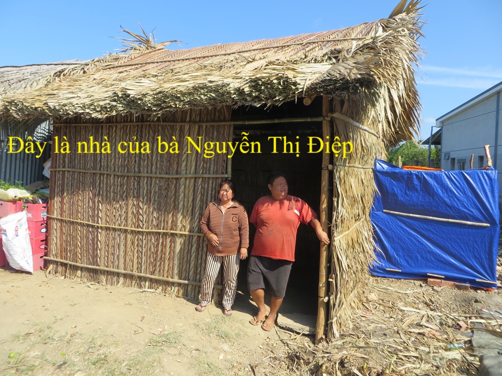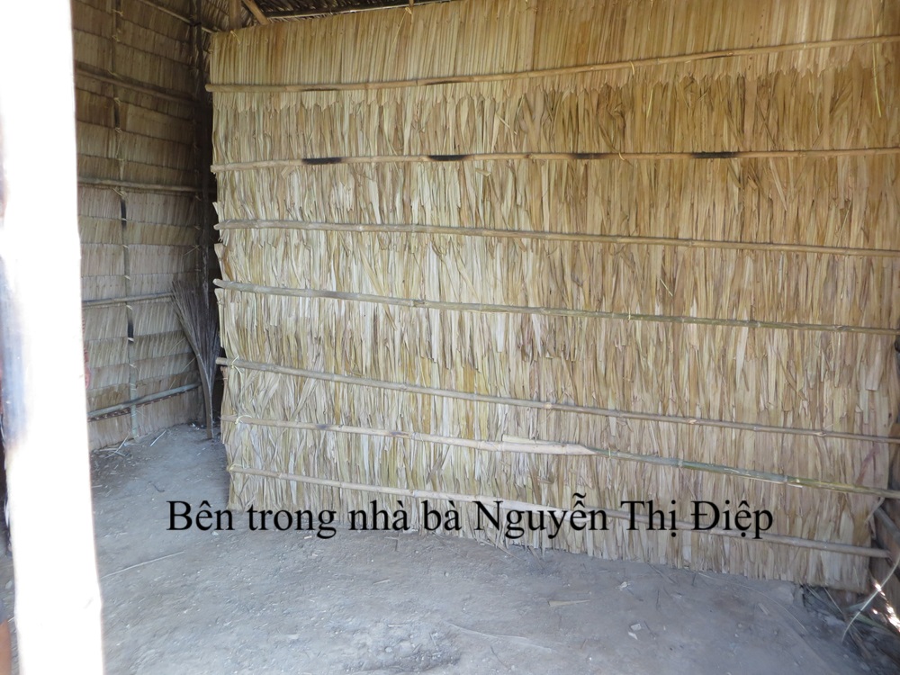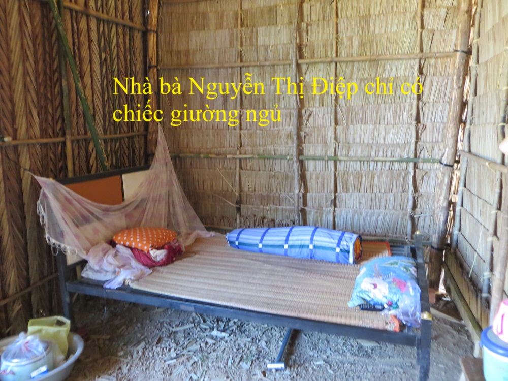 Bà Nguyễn Thị Điệp 62 tuổi bị bệnh đau thần kinh toạ, chồng chết bà hiện đang ở với người con trai tên Nguyễn Quốc Quân 35 tuổi. Cả hai không nghề nghiệp hiện con trai bà đi làm thuê ai thuê gì làm nấy tại địa phương. Nhà bà mới cất lại trên đất của người hang xóm nên không có số nhà. Trong nhà bà Điệp không có gì ngoài chiếc giường ngủ của bà. Hiện ại ngụ ấp Thạnh Tân, xã Bình Thạnh, huyện Thạnh Phú, tỉnh Bến Tre.