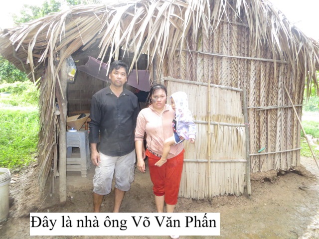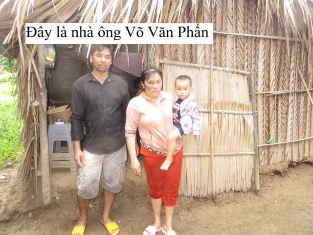 Võ Văn Phấn, 38 years old, and his wife Nguyễn Thị Sen, 33 years old, have one child, Võ Thanh Thuý, 2 years old. Mr. Phấn works at an ice factory, earning 4,000,000 VND per month. His wife stays home making handicrafts from water hyacinth for hire, earning 80,000 VND per day. Their income only covers daily living costs, so they cannot afford to build a water well and must rely on their neighbors for water. They currently live at 38/1, Thạnh An Hamlet, Bình Thạnh Commune, Thạnh Phú District, Bến Tre Province, now part of Thạnh Phú Commune, Vĩnh Long Province.