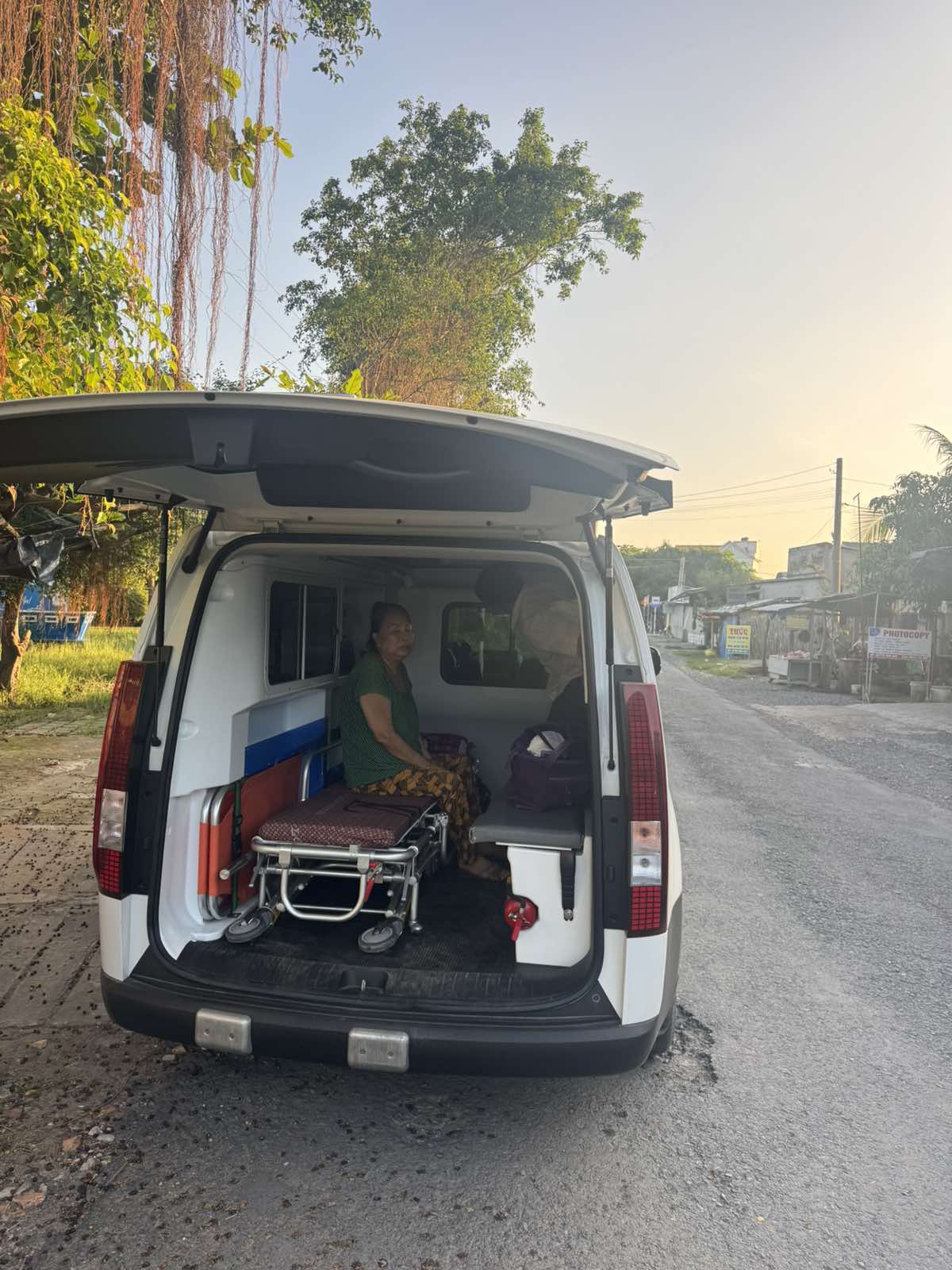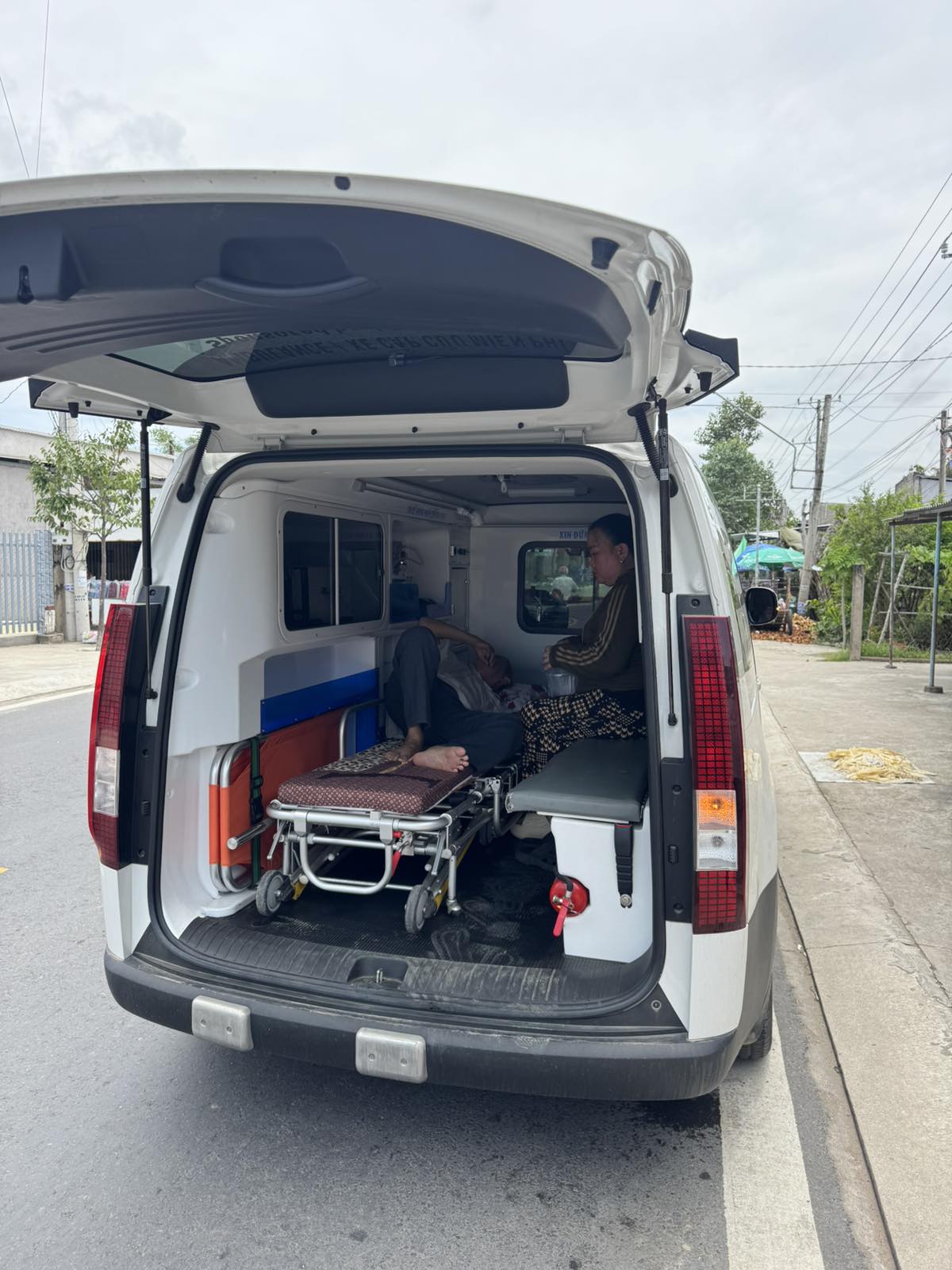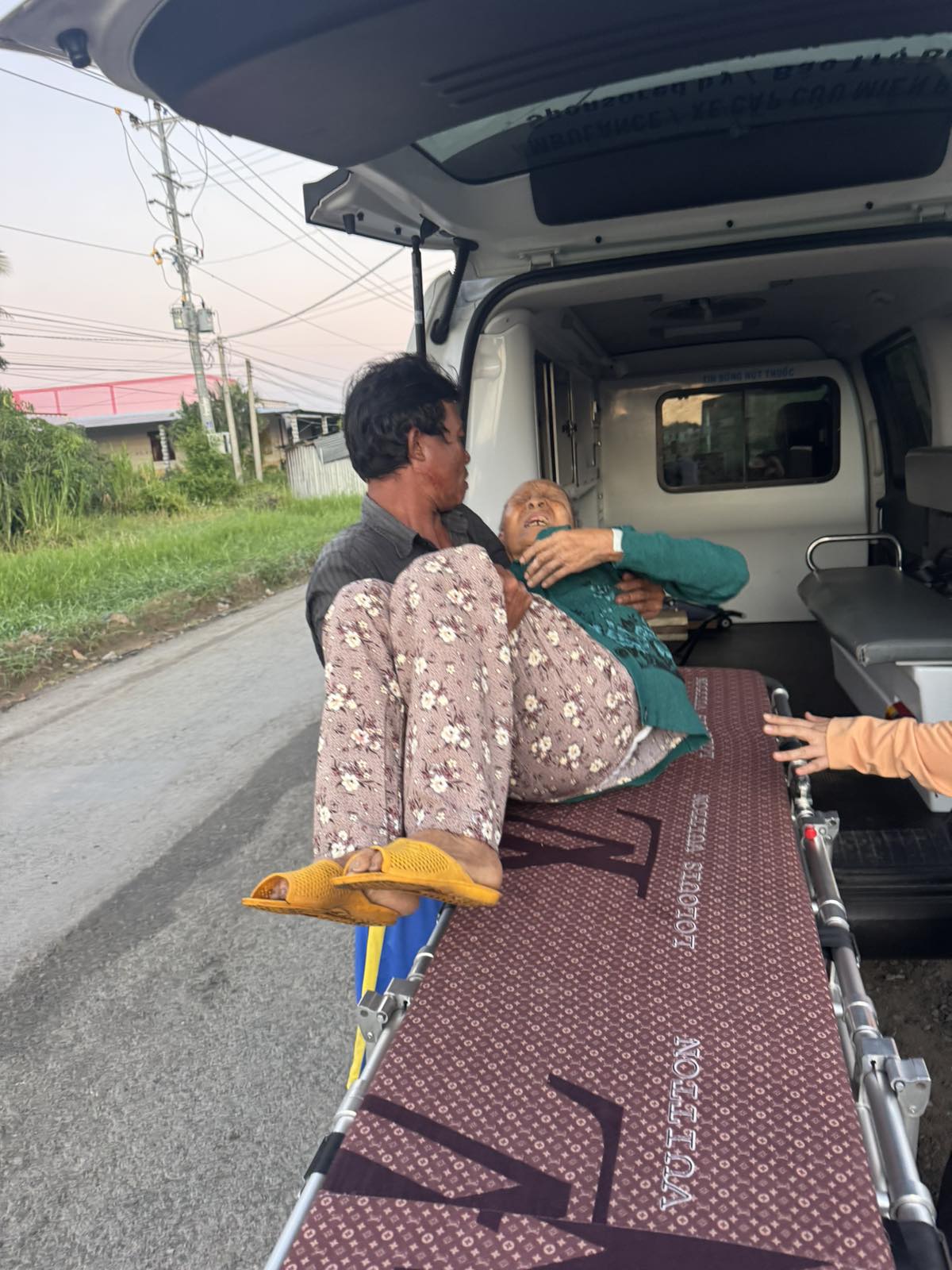 Mrs. Nguyễn Thị Sàn, 69 years old, lives in Cồn Chim, Thạnh Phong commune, Vĩnh Long province. She experienced fatigue and shortness of breath due to diabetes complications. An ambulance transported her to Thạnh Phú Hospital at 6:30 AM on August 5, 2025. She currently lives with her husband and child.