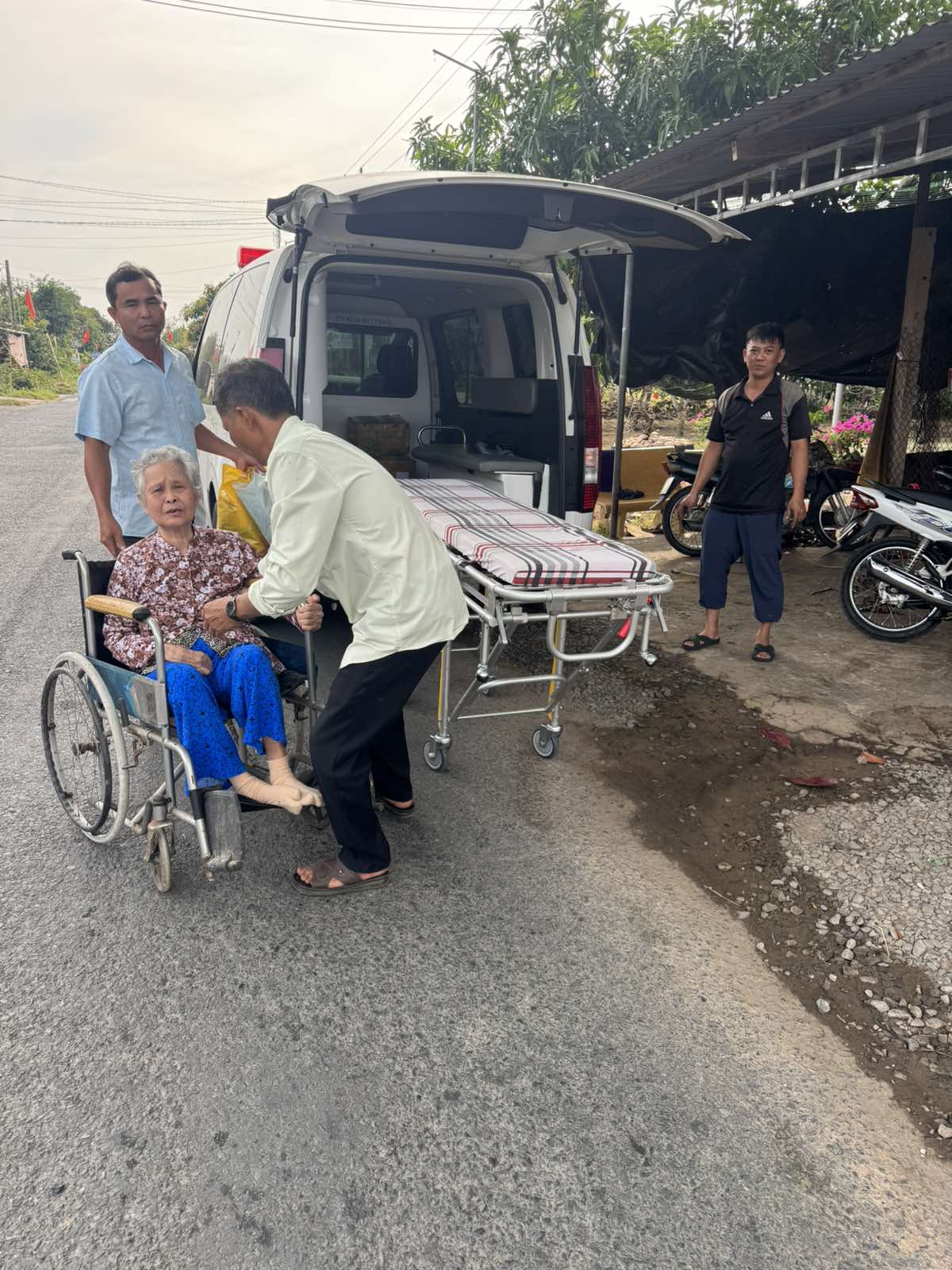 Ms. Nguyen Thi Quyen, 83 years old, lives in Ben Trai, An Thuan commune, Thanh Phu district, Ben Tre province. She was tired, and was taken to Thanh Phu hospital by ambulance at 3:30 a.m. on January 31, 2025. She currently lives with her children and grandchildren. The staff gave her a bottle of medicated green oil.