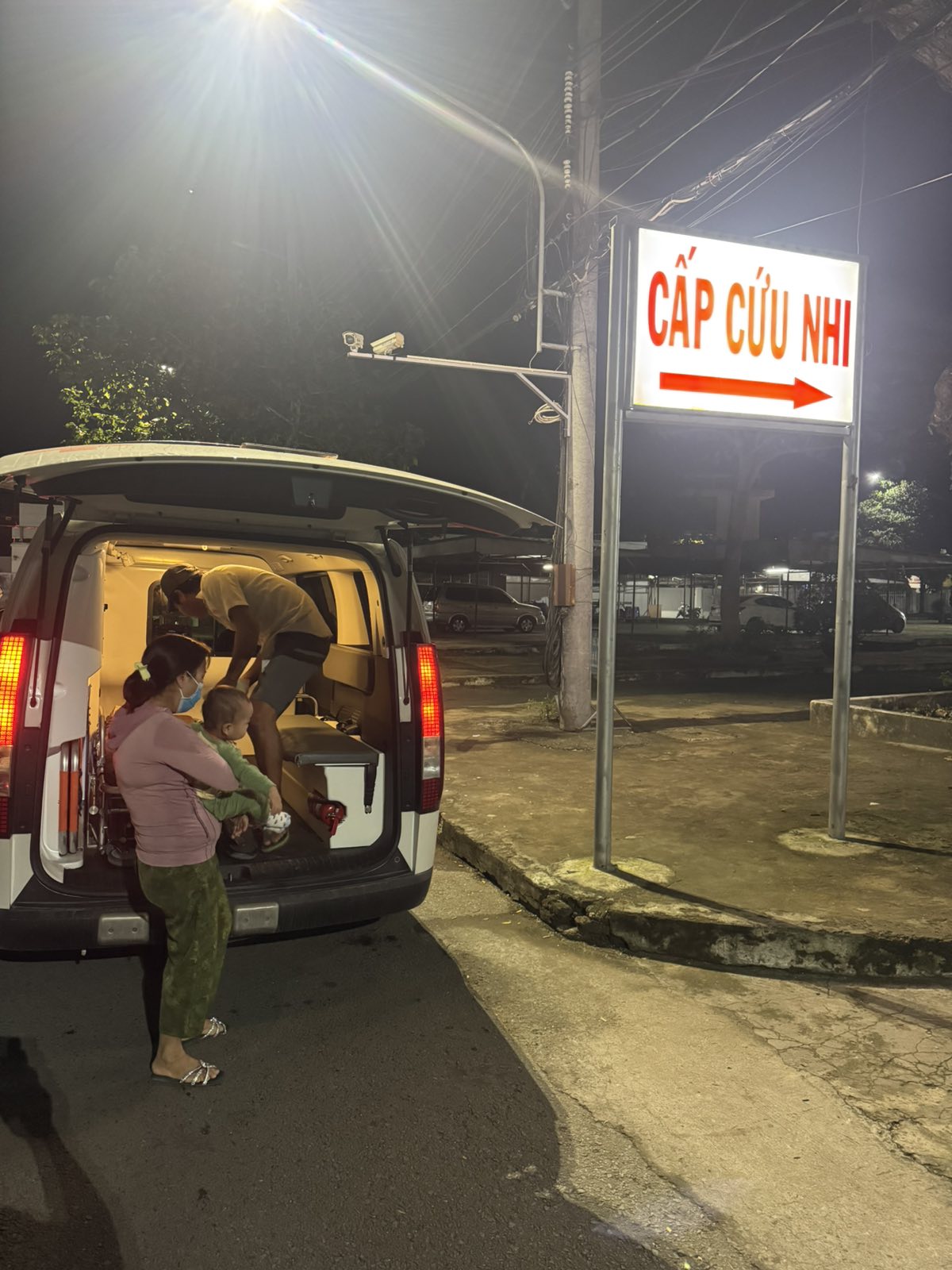 Nguyễn Hoàng Gia, 1 year old, lives in Xóm Chùa, Thạnh Phong commune, Vĩnh Long province. The child had a fever and seizures. An emergency vehicle took the child to Bến Tre Hospital at 3:15 AM on October 5, 2025.