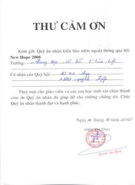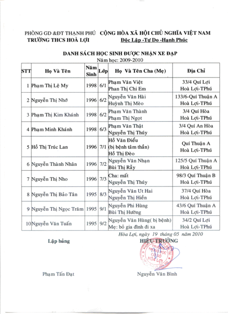 DANH SÁCH CHO XE ĐẠP HỌC SINH HÒA LỢI