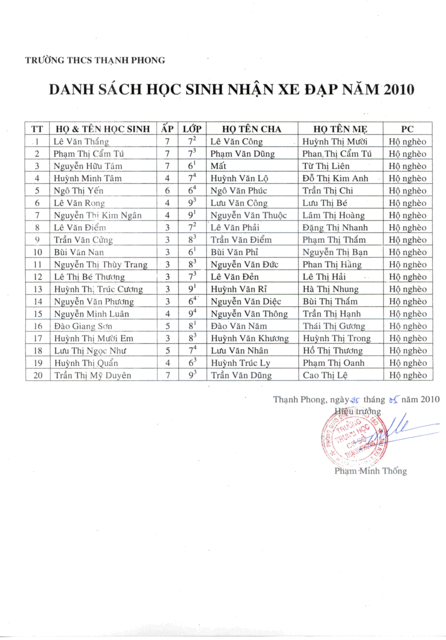 DANH SÁCH CÁC EM HỌC SINH ĐƯỢC NHẬN XE ĐẠP 2010 - Thạnh Phong