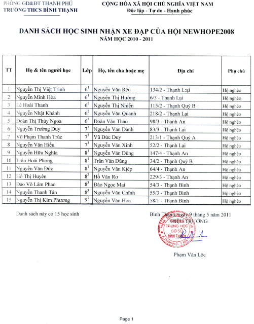Here is the list of bicycle recipients from Binh Thanh Junior High