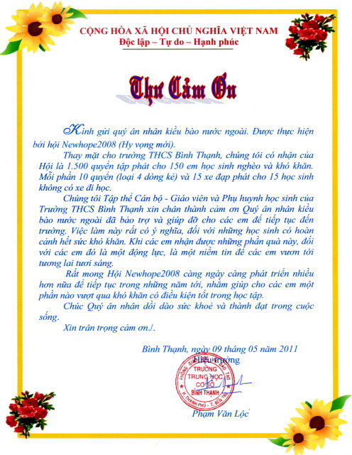 - Nguyen Minh Hoa, 6th grade student. His father abandoned him. His mother, Nguyen Thi Huong, has been remarried. Sometimes she sends money to raise him.