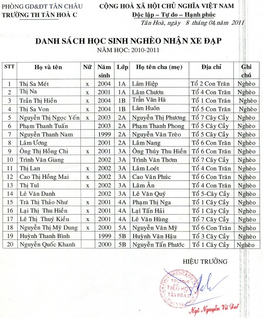 Here is the list of bicycle recipients from Tan Hoa Elementary School: