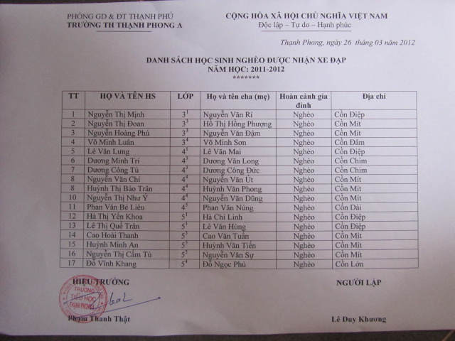 2012 - Phát Xe đạp ở TRƯỜNG CẤP I XÃ THẠNH PHONG A, HUYỆN THẠNH PHÚ.