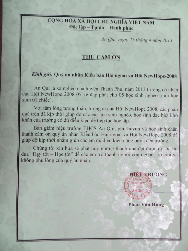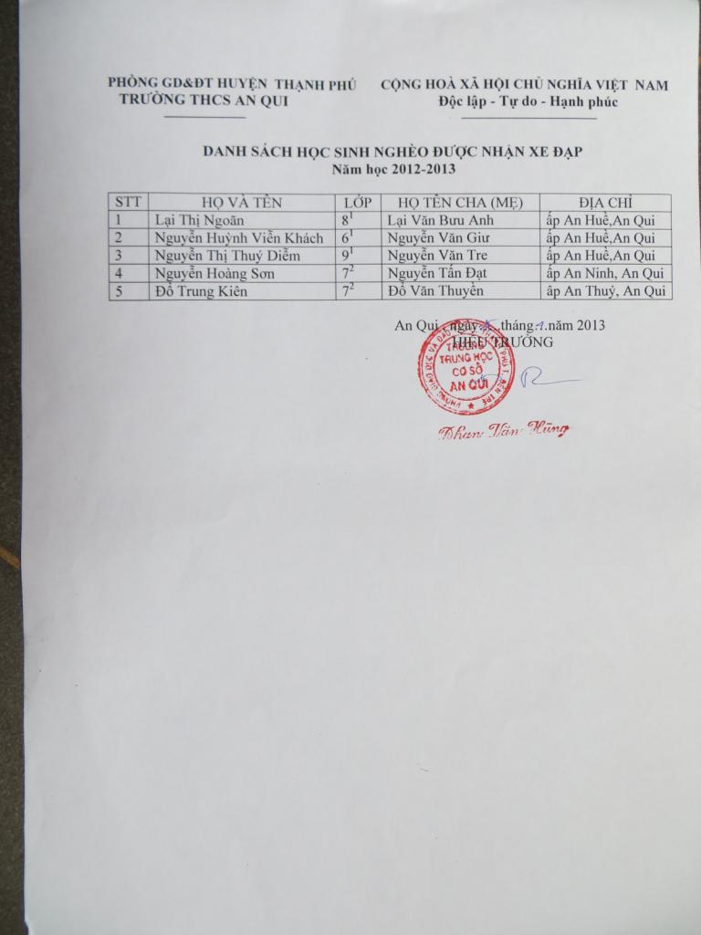 Nguyễn Huỳnh Viễn Khánh lớp 61. Cha: Nguyễn Văn Giư, mẹ Huỳnh Thị Kia. Có 2 anh em. Căn nhà đã sập, cha mẹ đi làm thuê ở thành phố, hai anh em ở đậu nhà ông nội. Nhà ở ấp An Huề xã An Qui