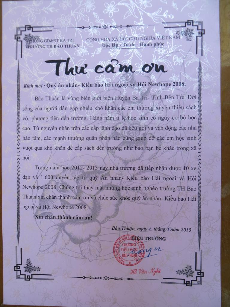 1. Tran Chi Dung, grade 3/4. His father Tran van Rang is living at Thanh Ninh Hamlet, Bao Thuan Village, Ba Tri District with his wife and their 2 children. working as a coolie while his wife does trivial things for cash.