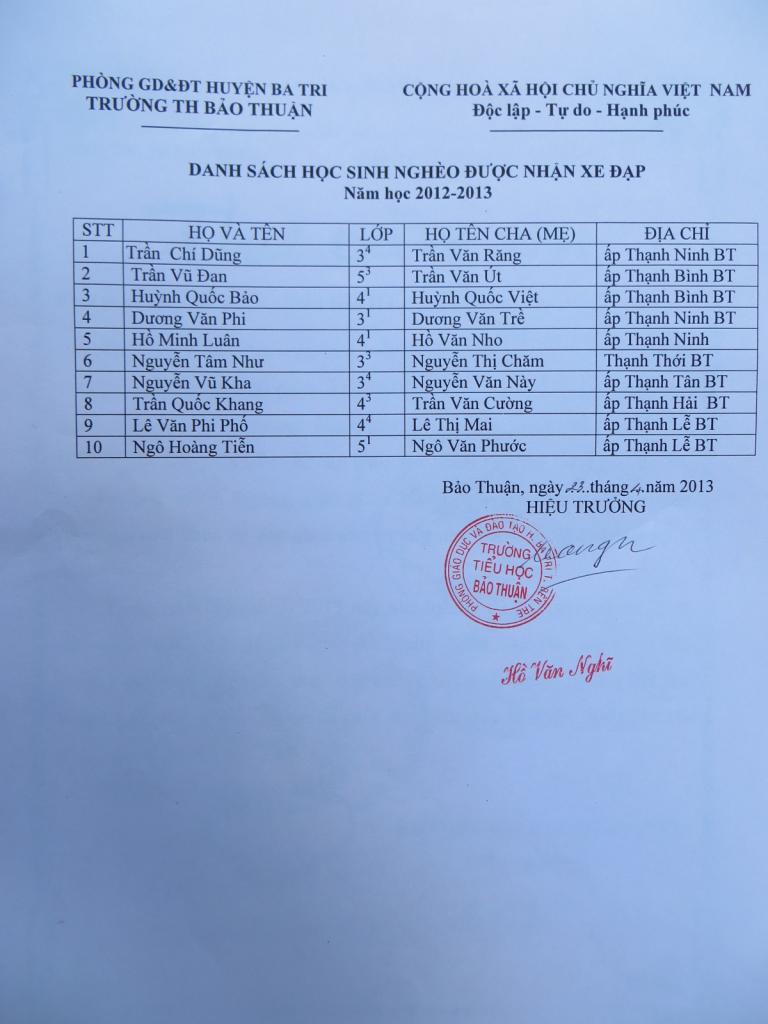 Trần Chí Dũng lớp 3/4. Cha: Trần Văn Răng có 2 con, ở ấp Thạnh Ninh xã Bảo Thuận huyện Ba Tri. Căn nhà đang ở đậu, cha đi làm culi, mẹ ai thuê gì làm nấy.