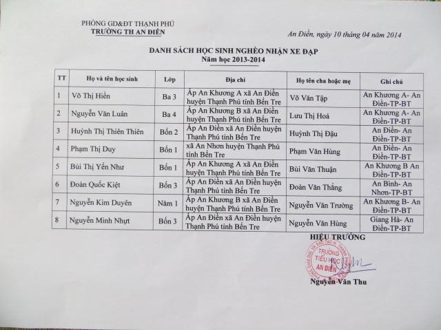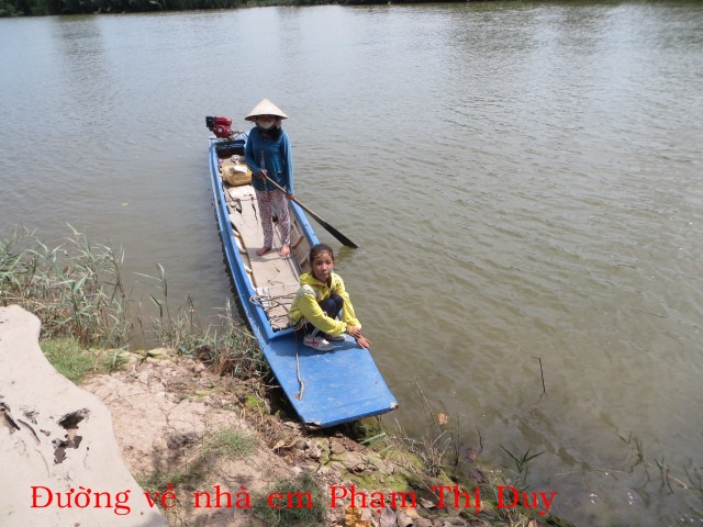 Em Phạm Thị Duy lớp 4/1. Cha: Phạm Văn Hùng có 3 con, ở ấp An Bình xã An Nhơn huyện Thạnh Phú tỉnh Bến Tre. Nhà em phải qua một đoạn sông dài, chiếc ghe của người thân đi rước em dùm.