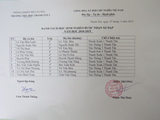 2019 - Bicycles Distribution - TRƯỜNG TIỂU HỌC THANH TÂN 2 - Thanh Tan Elementary school
