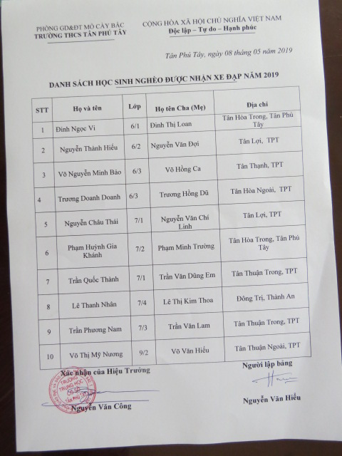 2019 - Bicycles Distribution - TRƯỜNG TRUNG HỌC CƠ SỞ TÂN PHÚ TÂY - Tan Phu Tay Junior High School