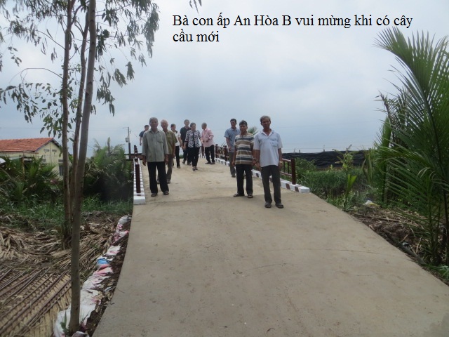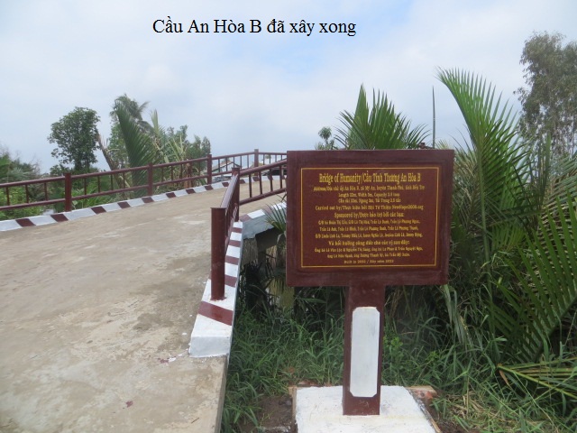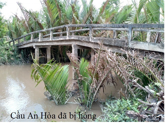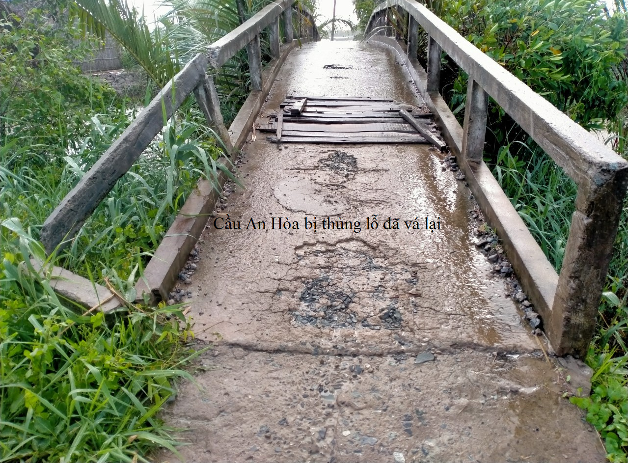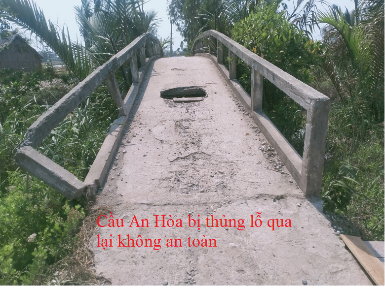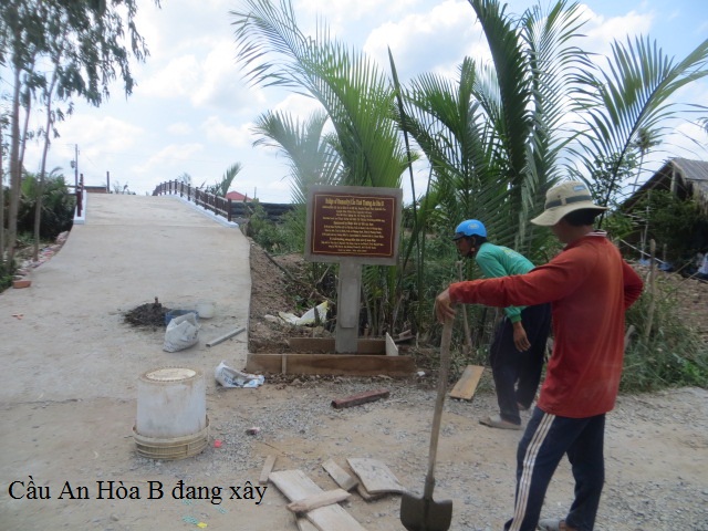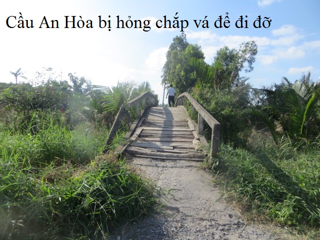 Cây cầu kế tiếp chúng ta muốn giúp xây là Cầu An Hòa ở ấp An Hòa B, xã Mỹ An, huyện Thạnh Phú, tỉnh Bến Tre.   Theo sự hiểu biết của chúng ta thì cầu này mới xây được 5 năm  nhưng lúc đó không đủ kinh phí nên đã xây không đủ chất lượng nên cầu đã bị bể ở giữa.   Vì khoảng bể quá to nên cây cầu không còn an toàn để đi lại.   Dù vậy, người dân trong làng vẫn tiếp tục dùng vi không có phương tiện khác.   Hiện tại cầu phục vụ cho khoảng 60 gia đình trong ấp An Hòa B, hàng ngày có hàng trăm người qua lại trên cầu.  Trong số người này có nhiều em học sinh ở trường tiểu học An Hòa kế bên và các em ở trường trung cấp An Hòa cách đó vài cây số.   Cây cầu bắt đầu bị bể từ 4 tháng trước và chổ nức càng ngày càng sâu thêm nên làng xã đã kêu gọi mạnh thường quân để giúp xây lại nhưng cho đến nay chưa được gì cả.  Vì là cầu nhỏ trong ấp cũng nhỏ nên cơ hội được chọn để xây không nhiều lắm.