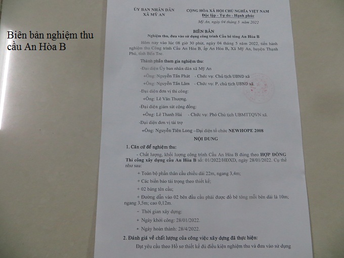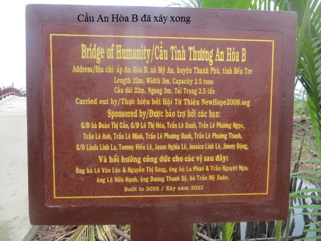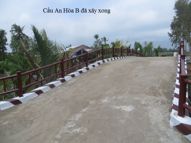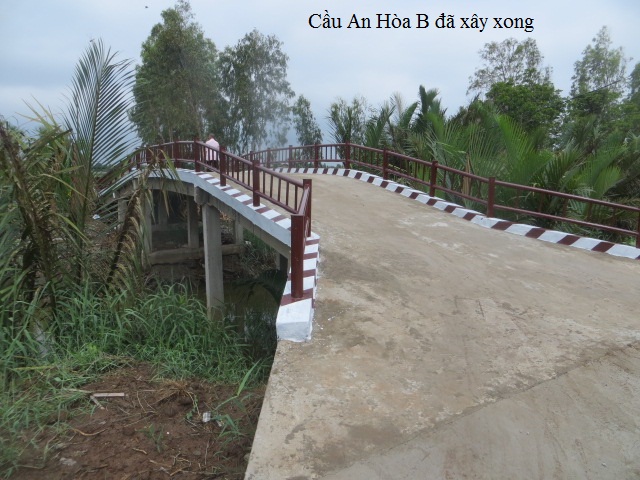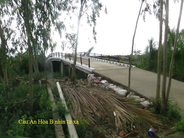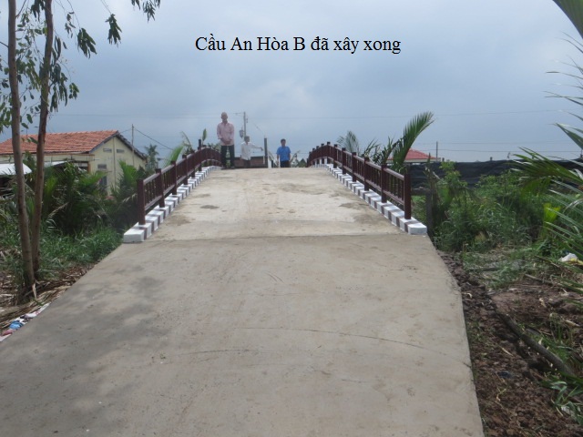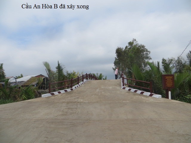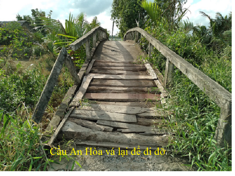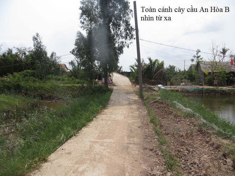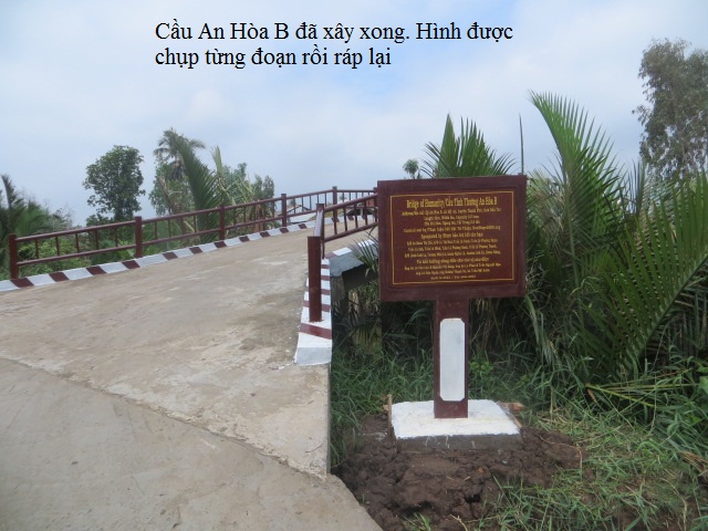 Cây cầu kế tiếp chúng ta muốn giúp xây là Cầu An Hòa ở ấp An Hòa B, xã Mỹ An, huyện Thạnh Phú, tỉnh Bến Tre.   Theo sự hiểu biết của chúng ta thì cầu này mới xây được 5 năm  nhưng lúc đó không đủ kinh phí nên đã xây không đủ chất lượng nên cầu đã bị bể ở giữa.   Vì khoảng bể quá to nên cây cầu không còn an toàn để đi lại.   Dù vậy, người dân trong làng vẫn tiếp tục dùng vi không có phương tiện khác.   Hiện tại cầu phục vụ cho khoảng 60 gia đình trong ấp An Hòa B, hàng ngày có hàng trăm người qua lại trên cầu.  Trong số người này có nhiều em học sinh ở trường tiểu học An Hòa kế bên và các em ở trường trung cấp An Hòa cách đó vài cây số.   Cây cầu bắt đầu bị bể từ 4 tháng trước và chổ nức càng ngày càng sâu thêm nên làng xã đã kêu gọi mạnh thường quân để giúp xây lại nhưng cho đến nay chưa được gì cả.  Vì là cầu nhỏ trong ấp cũng nhỏ nên cơ hội được chọn để xây không nhiều lắm.