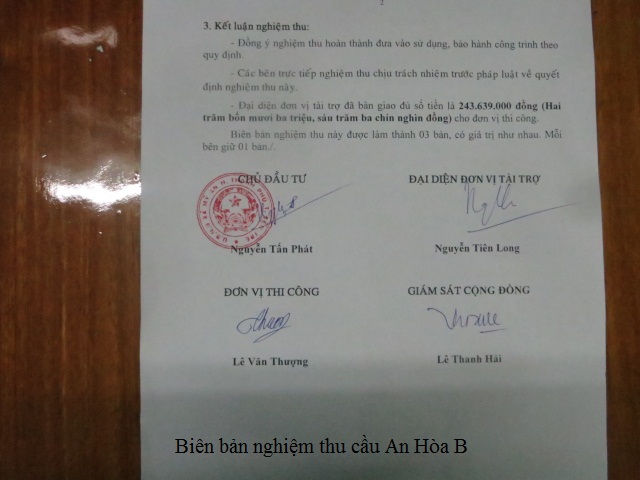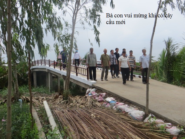 Dưới đây là hình ảnh của cầu được chụp trong ngày cầu được bàn giao cho dân làng nên có hình bà con đi qua lại . Ai nấy đều vô cùng vui mừng và rất cảm kích, họ nói cây cầu xây không những đẹp, lại rộng nên bà con qua lại vô cùng thoải mái, và nói từ đây tới mấy chục năm nữa không phải lo nữa.