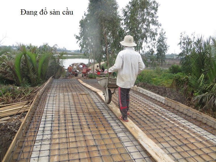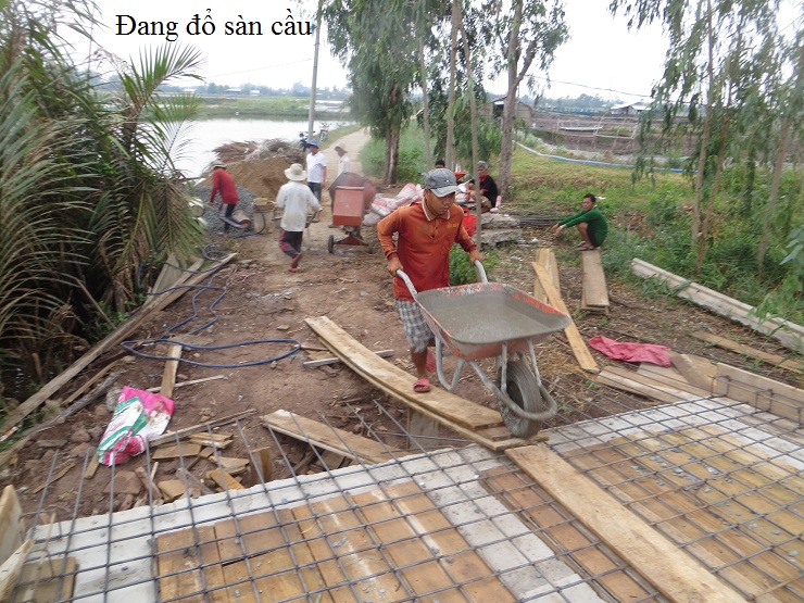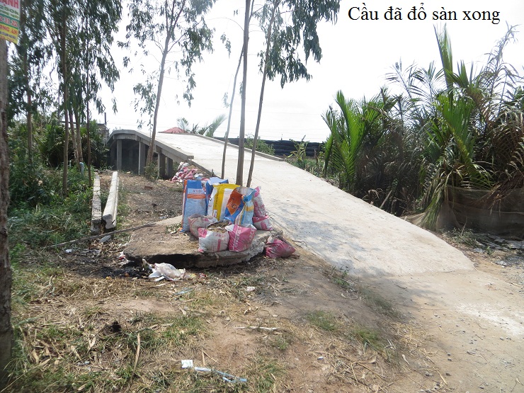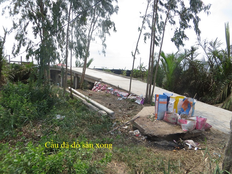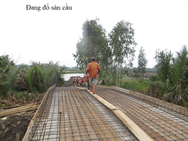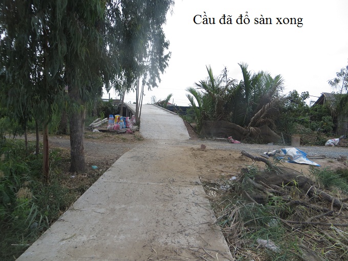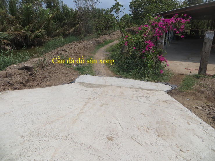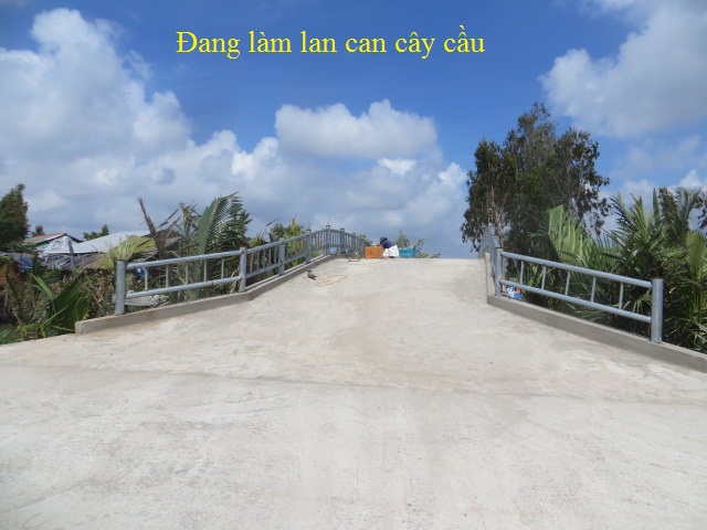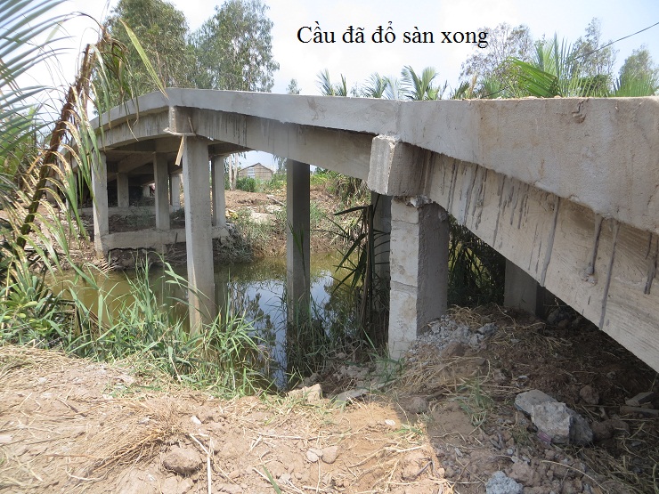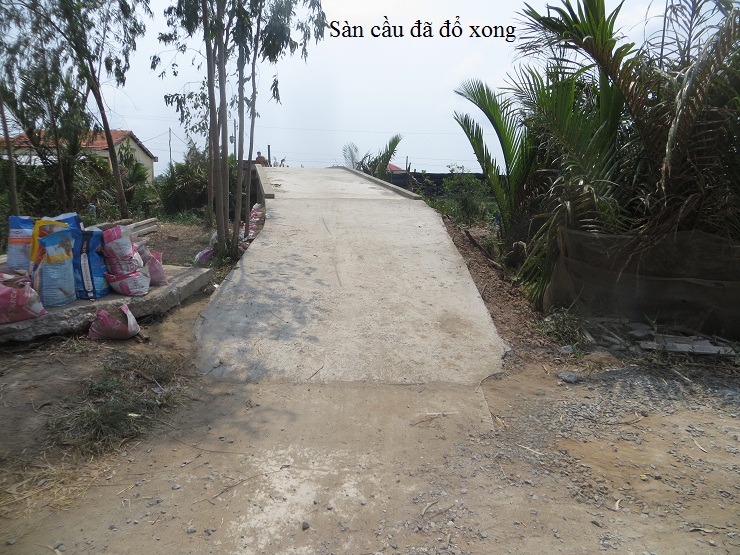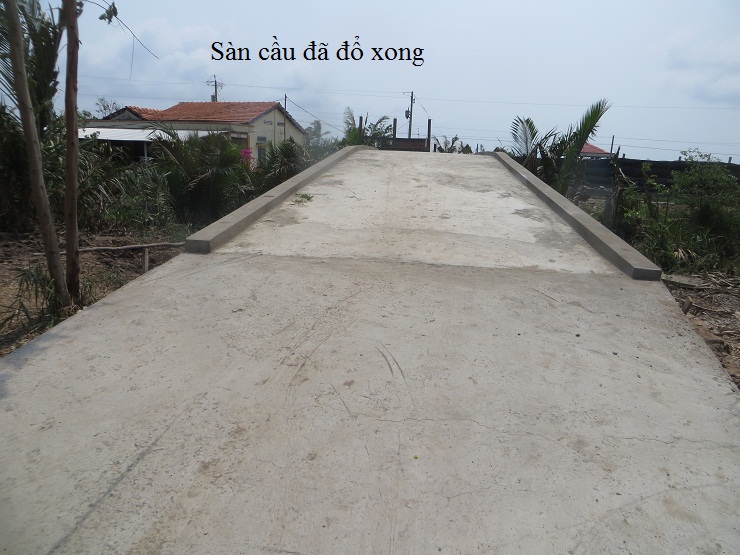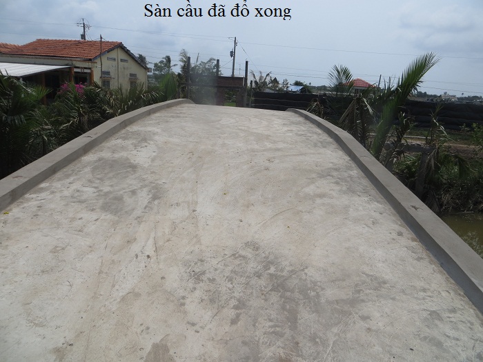 Chúng ta đã đổ xi măng xong sàn cầu. Những hình dưới đây chụp nhiều khía cạnh của cầu, mỗi hai bên cầu, trên cầu, dưới cầu và toàn cảnh chung quanh. Việc tiếp theo là xây lan can cho cầu. Lan can của chúng ta làm bằng thép nên chắc chắn và bền bỉ hơn những lan can bằng xi măng thường thấy trên những cây cầu nhỏ. Chúng ta đã trả thêm cho điều này, và một điều phụ trội nữa chúng ta đã làm thêm cho cây cầu này là tráng thêm 10 mét xi măng nối dài hai bên đầu cầu vào đường lộ. Thường đồ án xây cầu không có khoản này, họ chỉ xây cây cầu mà thôi. Chúng ta làm thêm vì muốn cho mọi người bước lên cầu được dề dàng hơn.