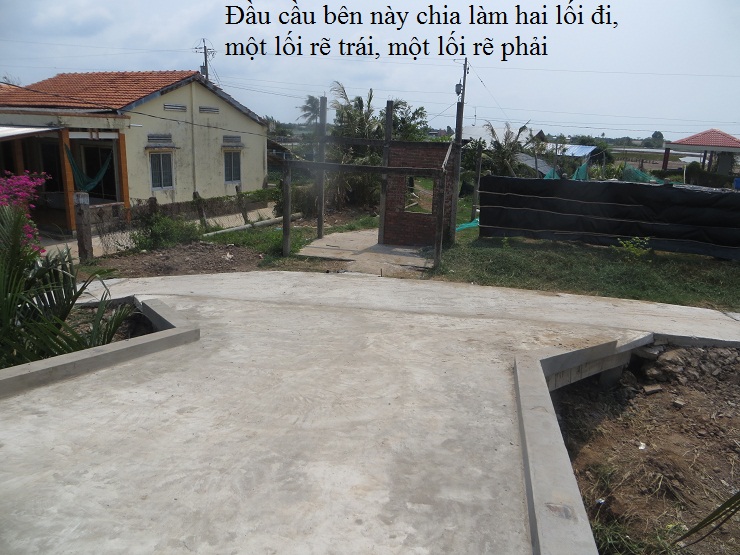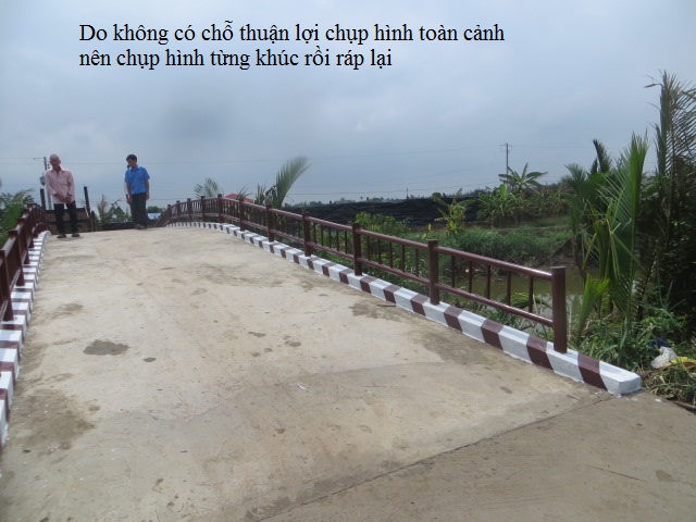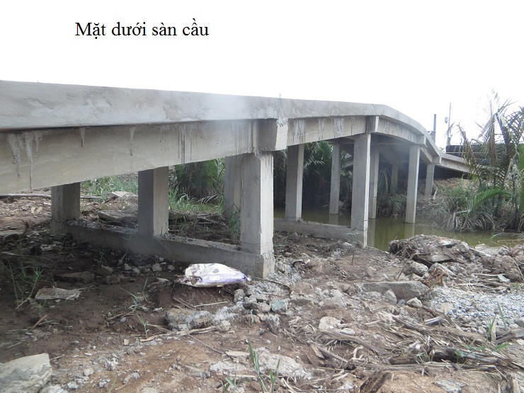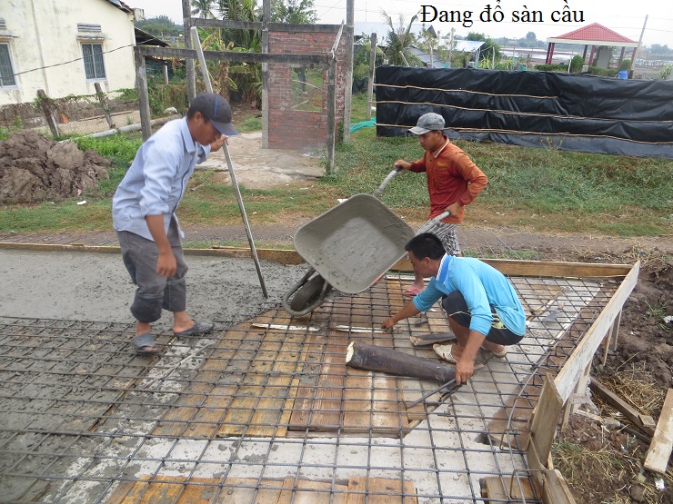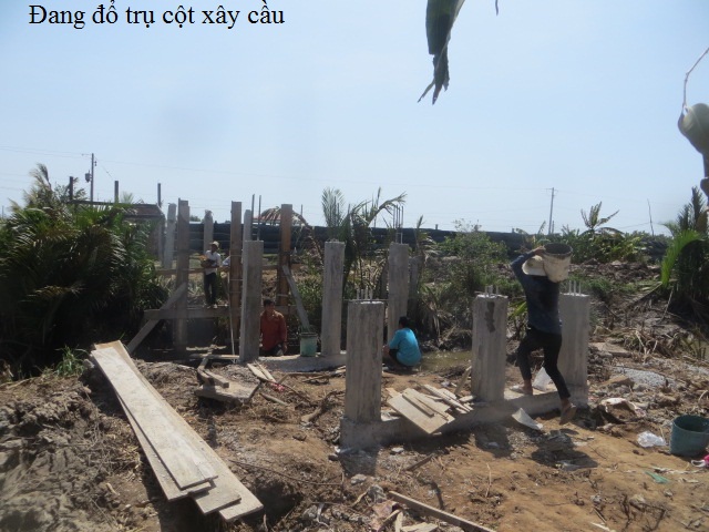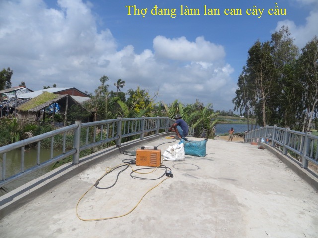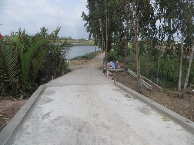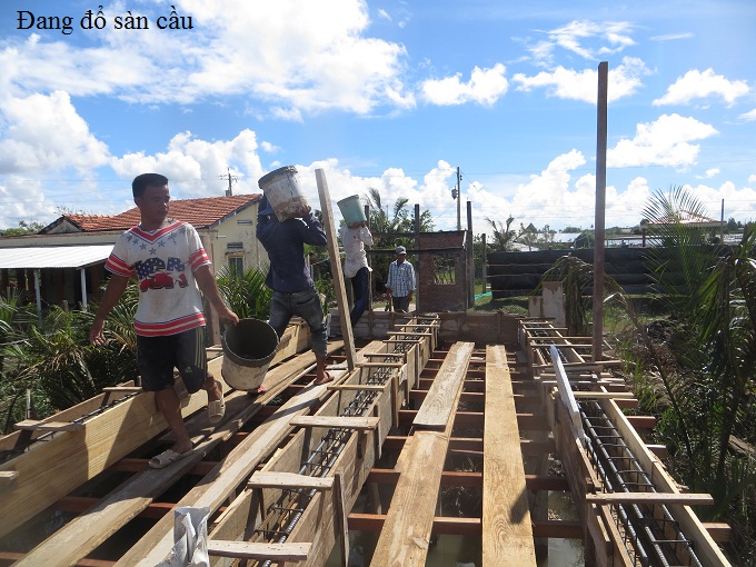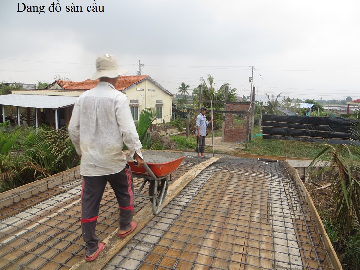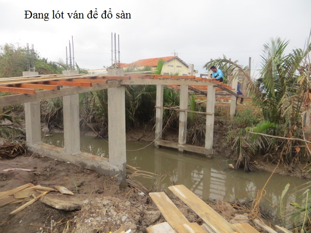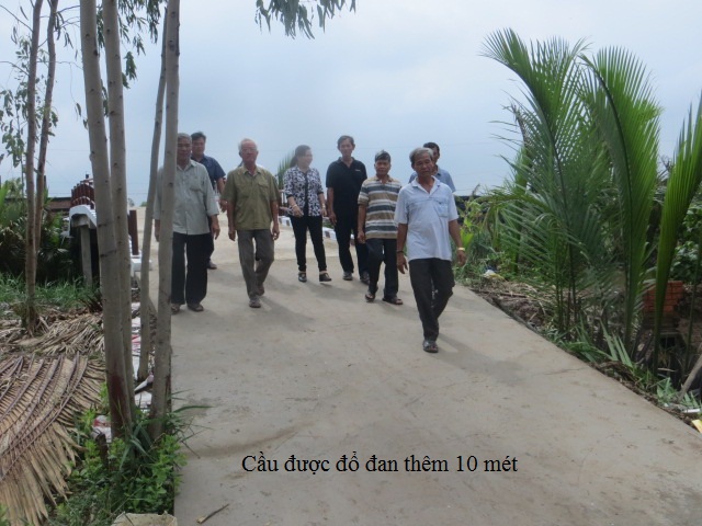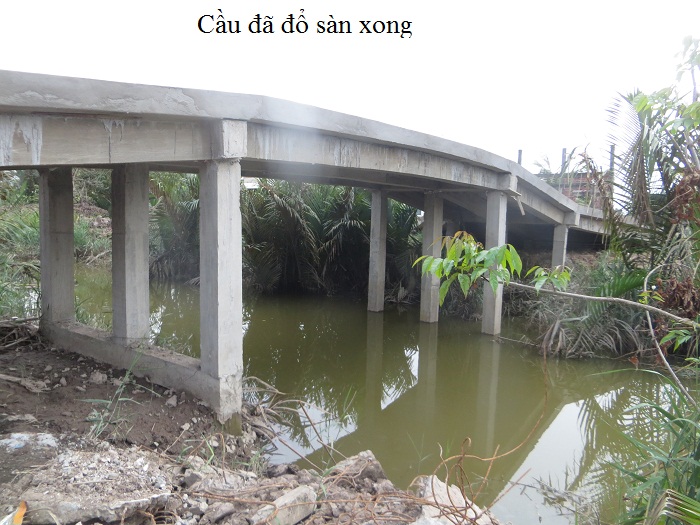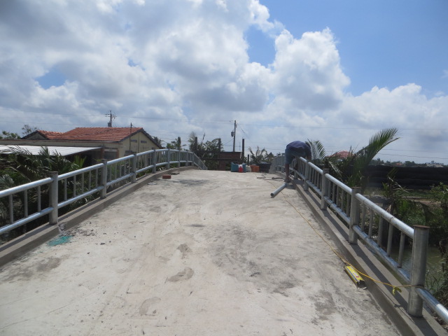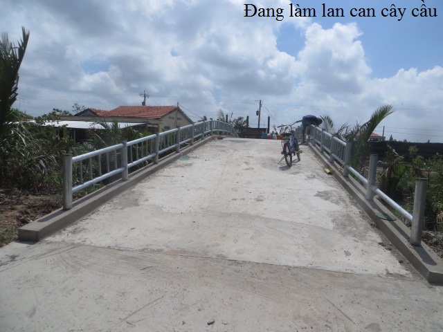 Chúng ta đã đổ xi măng xong sàn cầu. Những hình dưới đây chụp nhiều khía cạnh của cầu, mỗi hai bên cầu, trên cầu, dưới cầu và toàn cảnh chung quanh. Việc tiếp theo là xây lan can cho cầu. Lan can của chúng ta làm bằng thép nên chắc chắn và bền bỉ hơn những lan can bằng xi măng thường thấy trên những cây cầu nhỏ. Chúng ta đã trả thêm cho điều này, và một điều phụ trội nữa chúng ta đã làm thêm cho cây cầu này là tráng thêm 10 mét xi măng nối dài hai bên đầu cầu vào đường lộ. Thường đồ án xây cầu không có khoản này, họ chỉ xây cây cầu mà thôi. Chúng ta làm thêm vì muốn cho mọi người bước lên cầu được dề dàng hơn.