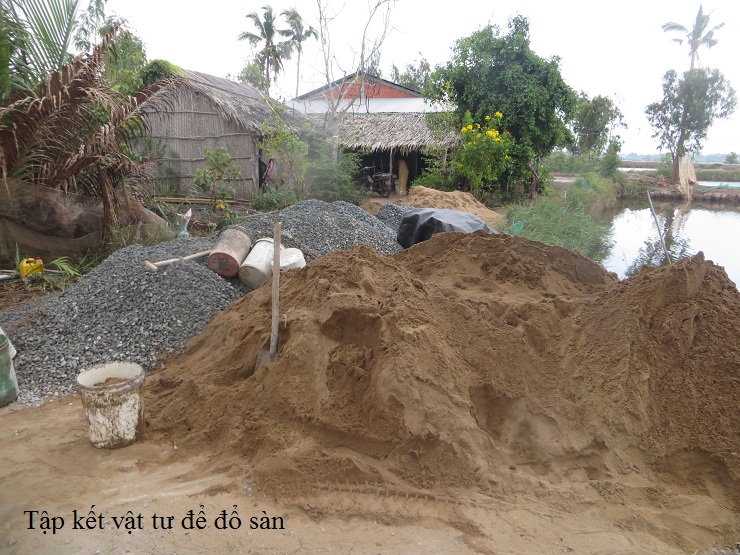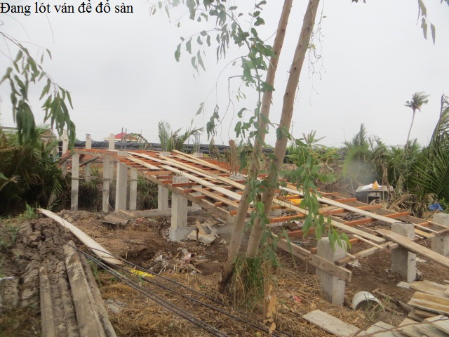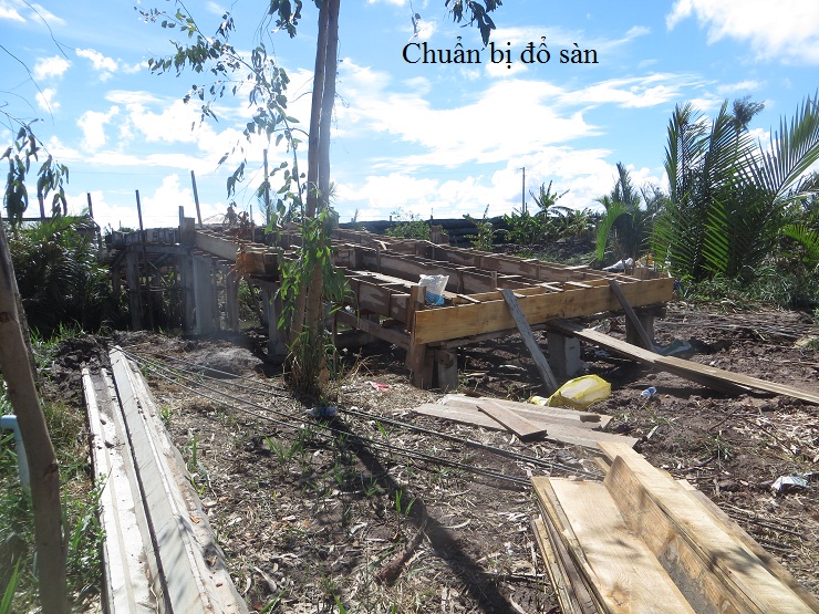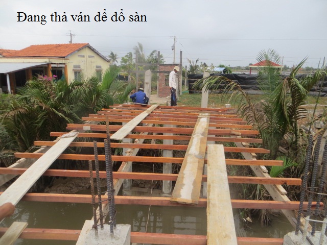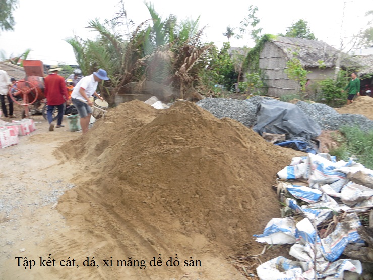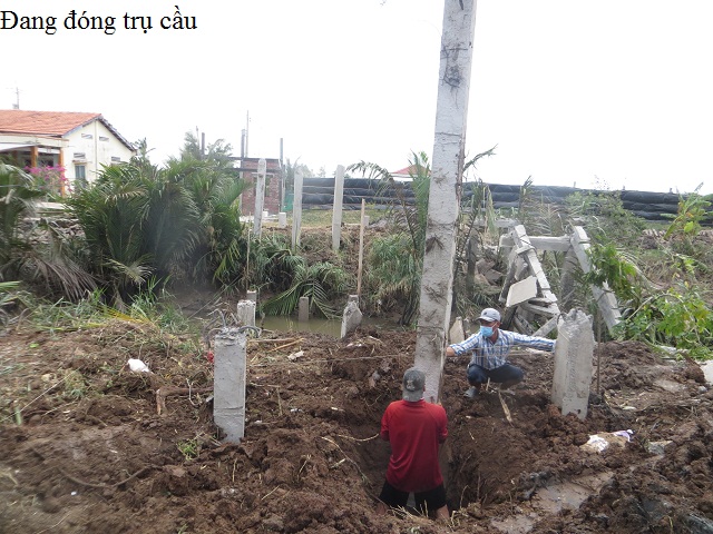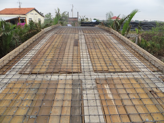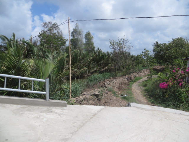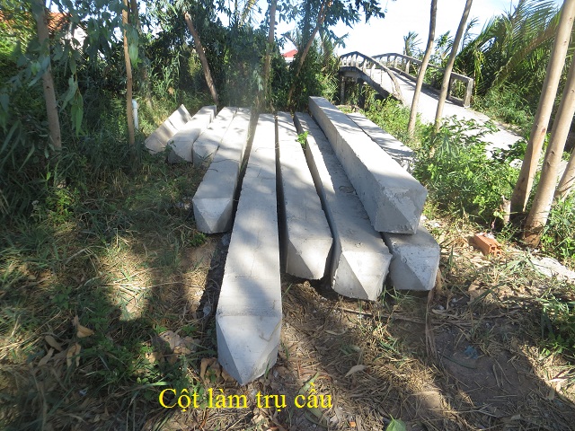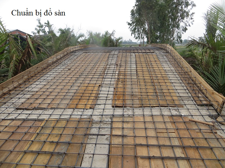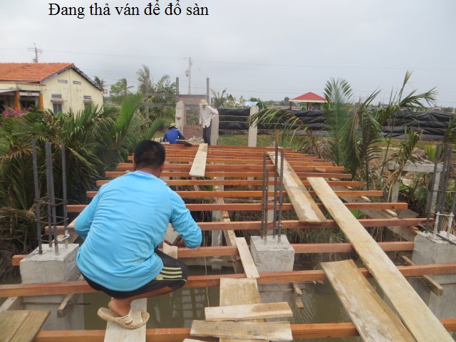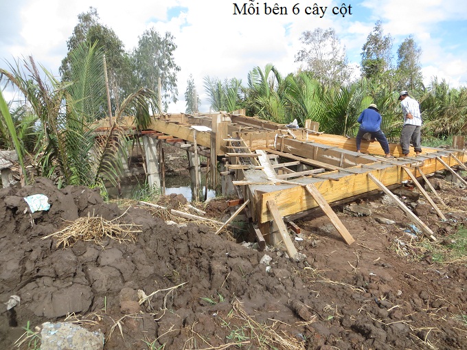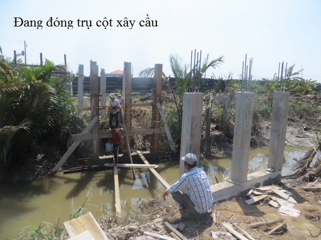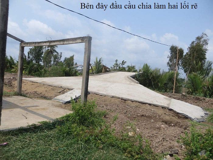 Chúng ta đã đổ xi măng xong sàn cầu. Những hình dưới đây chụp nhiều khía cạnh của cầu, mỗi hai bên cầu, trên cầu, dưới cầu và toàn cảnh chung quanh. Việc tiếp theo là xây lan can cho cầu. Lan can của chúng ta làm bằng thép nên chắc chắn và bền bỉ hơn những lan can bằng xi măng thường thấy trên những cây cầu nhỏ. Chúng ta đã trả thêm cho điều này, và một điều phụ trội nữa chúng ta đã làm thêm cho cây cầu này là tráng thêm 10 mét xi măng nối dài hai bên đầu cầu vào đường lộ. Thường đồ án xây cầu không có khoản này, họ chỉ xây cây cầu mà thôi. Chúng ta làm thêm vì muốn cho mọi người bước lên cầu được dề dàng hơn.