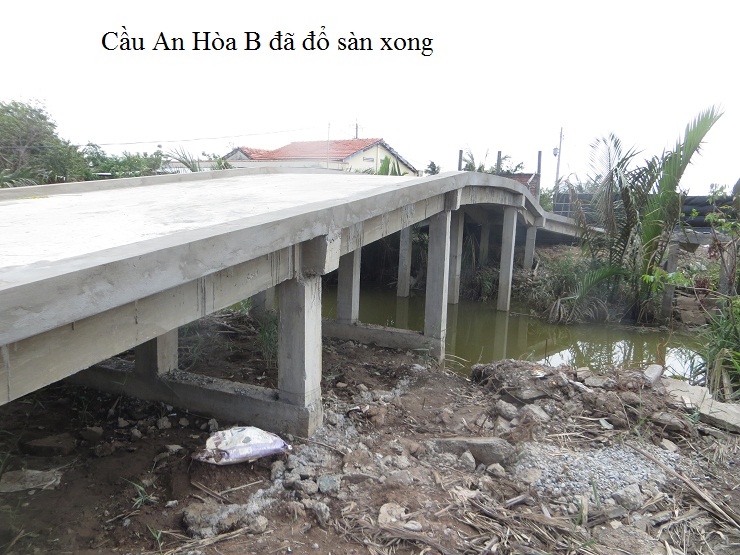 Chúng ta đã bắt đầu từ đúc những cây cột bê tông cốt sắt, và cho máy đóng xuống lòng sông. Tháng đầu tiên làm rất chậm vì phải chờ nước ròng mới đóng cột xuống được. Sau khi cột đã đóng xong thì dựng thành trụ, một trụ có 3 cột và cái đà ngang. Cầu An Hòa có 6 trụ. Cái cầu cũ cũng đã được giựt sập để có đủ chổ xây cái mới. Hiện tại thợ đang làm tới lòng cầu, từ đây tiến độ làm sẽ nhanh hơn vì không cần chờ nước ròng nữa. Dưới đây là hình ảnh của cầu đang xây. Nếu muốn đọc thêm chi tiết mời các bạn click vào link Bảng Vẽ phía trên.
