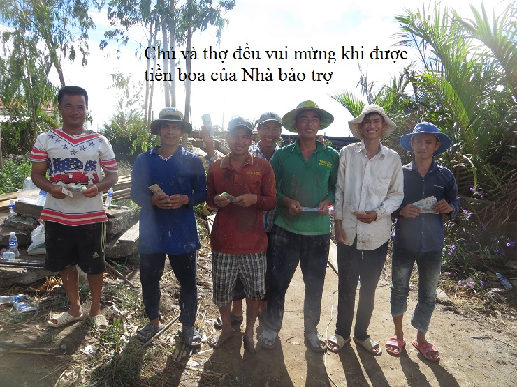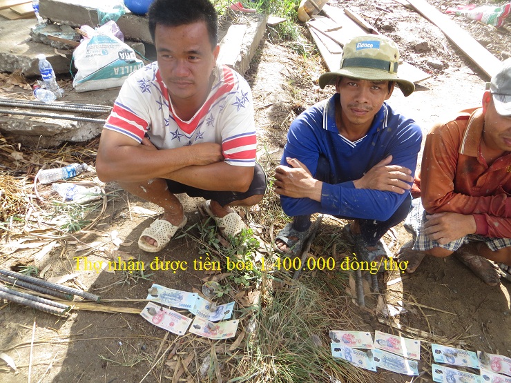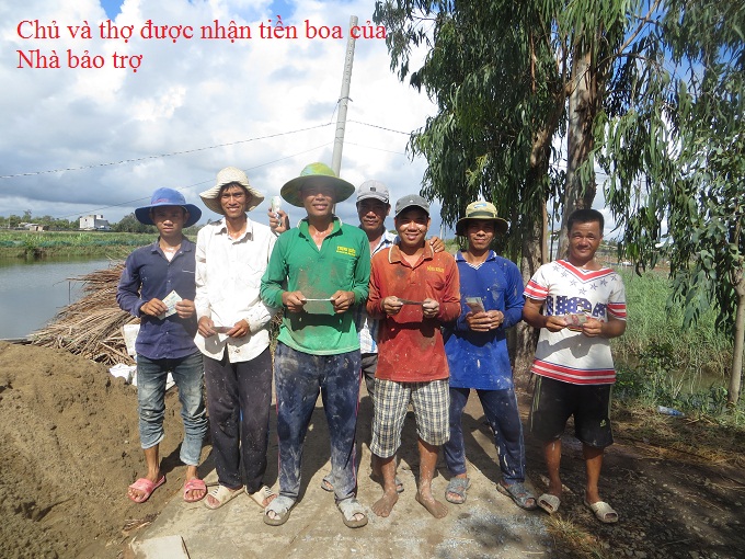 Dưới đây là hình ảnh của các giai đoạn mới trong việc xây cầu. Chúng ta có ghi chú thích trong từng tấm hình. Trong tuần này chúng ta đã đi phát tiên thưởng cho các thợ và anh chủ thầu. Đáng lẽ chờ đến cầu làm xong mới phát nhưng đã được 2/3 đoạn đường và chúng ta nghĩ đây là thời điểm thích hợp để cho mọi người được lên tình thần. Và chúng ta đã phát sau khi có sự đồng ý của ân nhân bảo trợ. Tất cả mọi người đều vô cùng biết ơn và mừng rỡ với món quà vô cùng ngạc nhiên này. Chúng ta cũng đã xin phép người bảo trợ chia tiền thưởng làm 2 phần, cho người thợ thầu chánh phần nữa và còn lại phân nữa chia cho các thợ khac'. Lý do vì người chủ thầu kỳ này không có lời vì lạm phát làm vật giá lên quá và tiền công thợ cũng lên. Xin các bạn kéo xuống để xem hình mới xây cầu và hình phát thưởng cho các thợ.