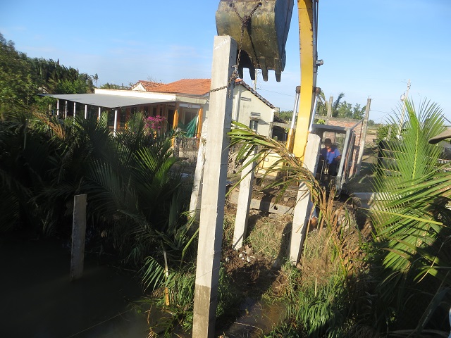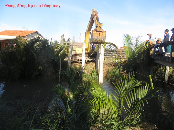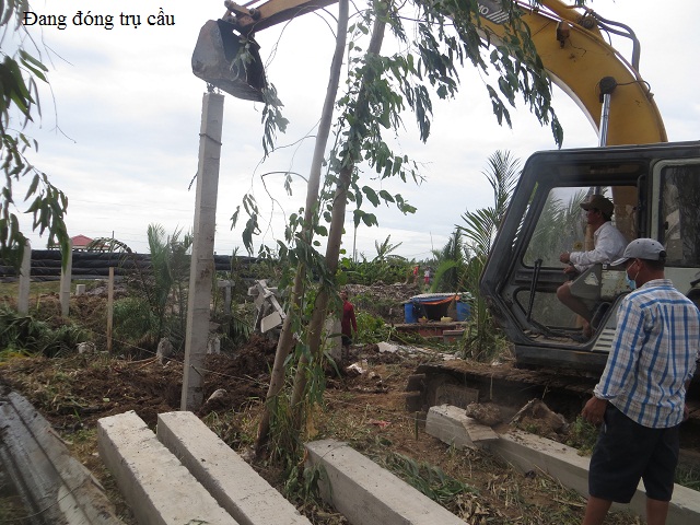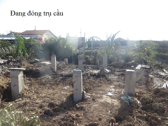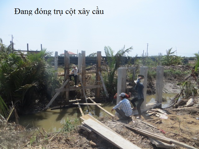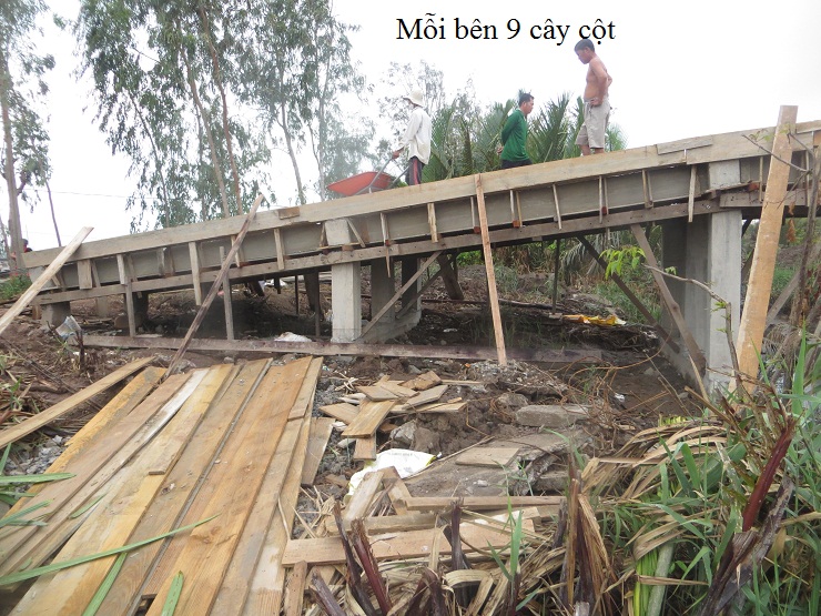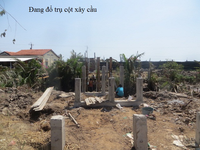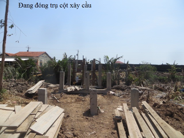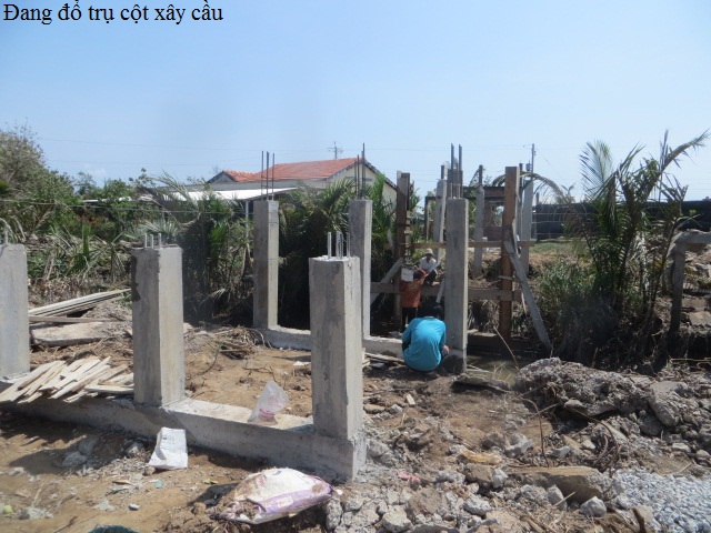 An Hoa B Bridge is being built and expected to be completed on time-- in mid-May. We started from making the reinforced concrete columns, then installed them deep in the river to make 6 sections of 3 pillars each. The first month was very slow because we had to wait for the water to recede to install the columns. Once all columns were done, they were connected in a set of three, and we have 6 sets of reinforced pillars. The old bridge was also demolished to make room for a new one. Currently, the workers are working on making the deck. From here the progress will be faster because there is no need to wait for the water to recede. Below are the pictures An Hoa B bridge as it is being built. For full construction details, please click on The Plot Plan link above.