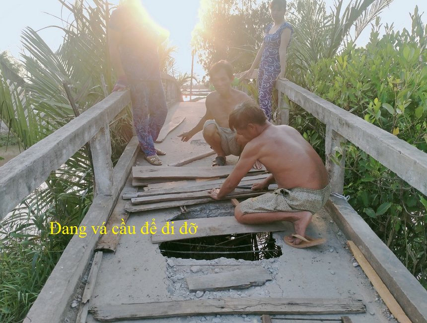 The next bridge we want to help build is An Hoa Bridge in An Hoa B hamlet, My An commune, Thanh Phu district, Ben Tre province. It is our understanding that this bridge has only been built for 5 years, but at that time, there was not enough funding, so it was poorly built. And the result was it got broken in the middle and created a large hole. Because the hole is too big, the bridge is no longer safe to walk on. Even so, people in the village continue to use it because they have no other means of transport. Currently, the bridge serves about 60 families in An Hoa B hamlet, with hundreds of people crossing the bridge every day. Among these people are many students at An Hoa elementary school next door and students at An Hoa middle school which is a few kilometers away. The bridge started to break 4 months ago and the gap is getting deeper and deeper. The village has been trying to get help from many sources to rebuild the bridge, so far it has not found any. Because it is a small bridge in the hamlet, the opportunity to get chosen is not great.
